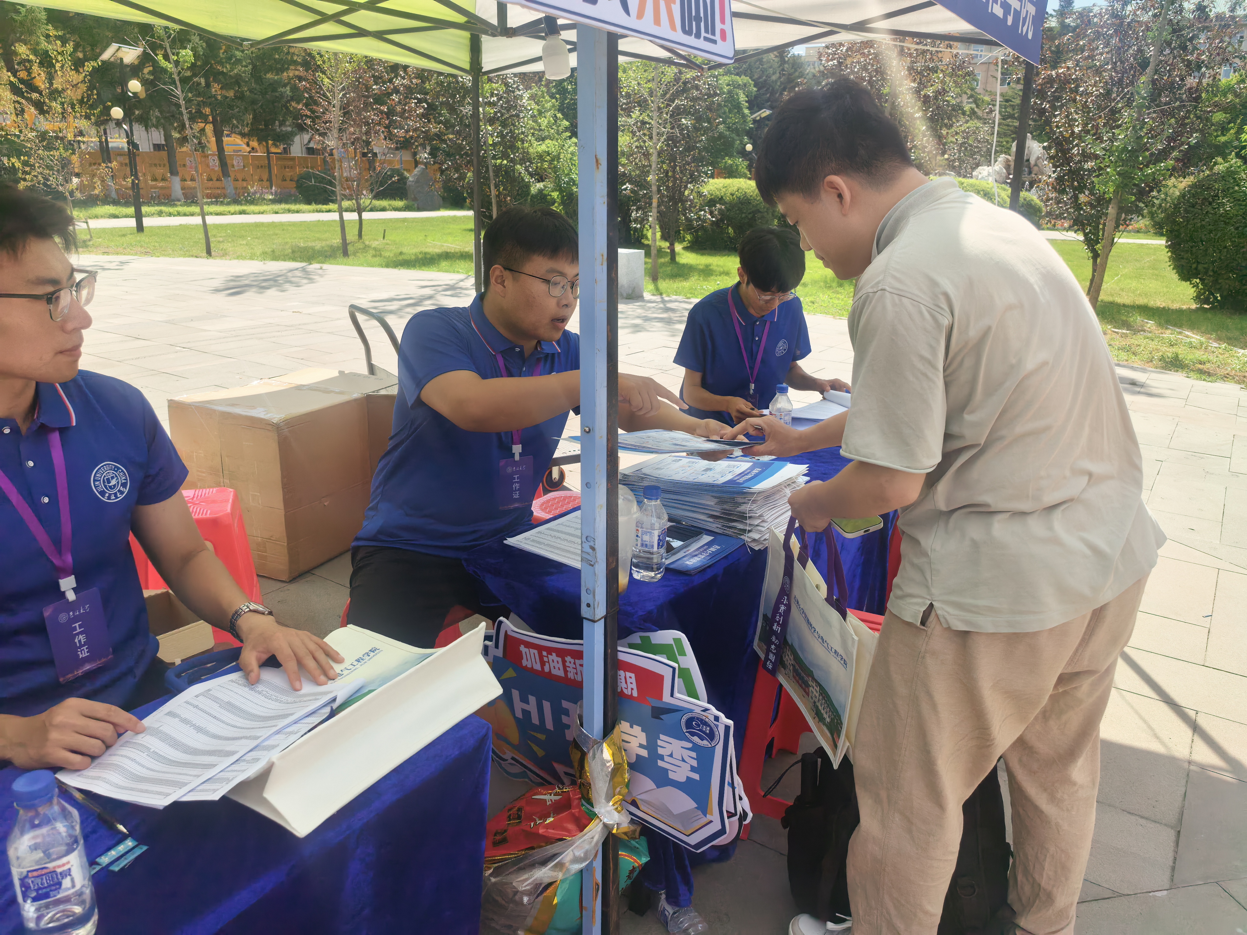 8月19日是正式报到的前一天,各位志愿者认真布置迎新场地,学校党委副书记丁世海老师现场指导工作。丁书记叮嘱各位老师和志愿者要积极营造“文明、有序、高效、温馨”的迎新氛围,将迎新各项工作落实落细。