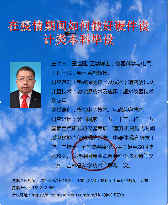 举办里疫情期间系列线上专题讲座。2022年3月16日,由我学院副教授王世隆老师针对“在疫情期间如何做好硬件设计类本科毕设”问题进行讲解。会议由教学副院长刘长胜教授主持,参与会议的有毕业设计的指导教师和2018级的同学200余人。