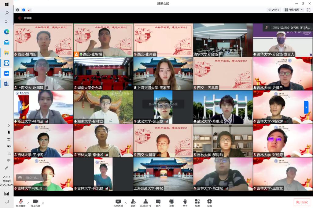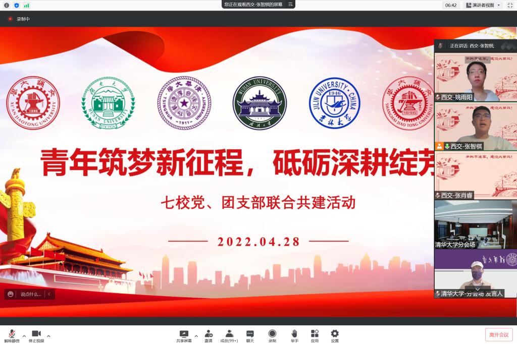 2022年4月28日晚,联合开展青年筑梦新征程,砥砺深耕绽芳华”党团共建系列活动在腾讯会议线上举行,次活动由西安交通大学主办,来自西安交通大学、湖南大学清华大学、武汉大学、吉林大学上海交通大学、浙江大学七所的党员参与其中党委副书记副院长周伟老师测控本科生党支部书记马姗姗老师出席活动