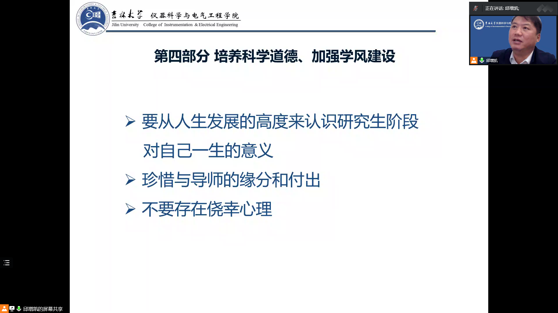 随后,邱增凯教授就《吉林大学研究生手册》和学校规章制度向新生作了简洁而深入的讲解,着重讲解了《吉林大学研究生学术不端行为处理办法》和《吉林大学研究生违纪处分规定》。“没有规矩,不成方圆”,尤其对学术不端行为提出重点警戒,并指出遵守学术规范,严守学术底线,共同营造良好的学术环境是作为一名研究生应该时刻牢记和遵守的准则。