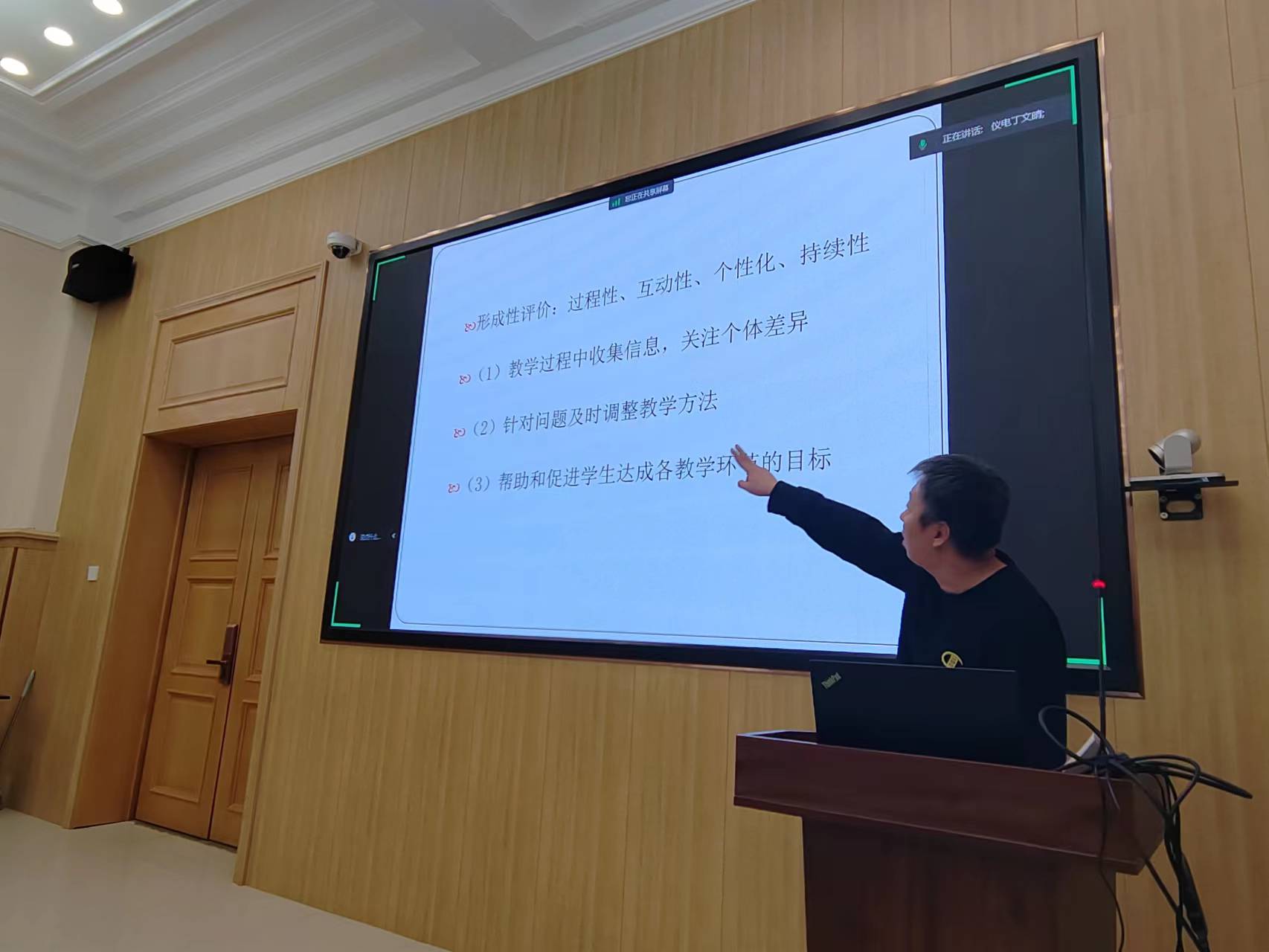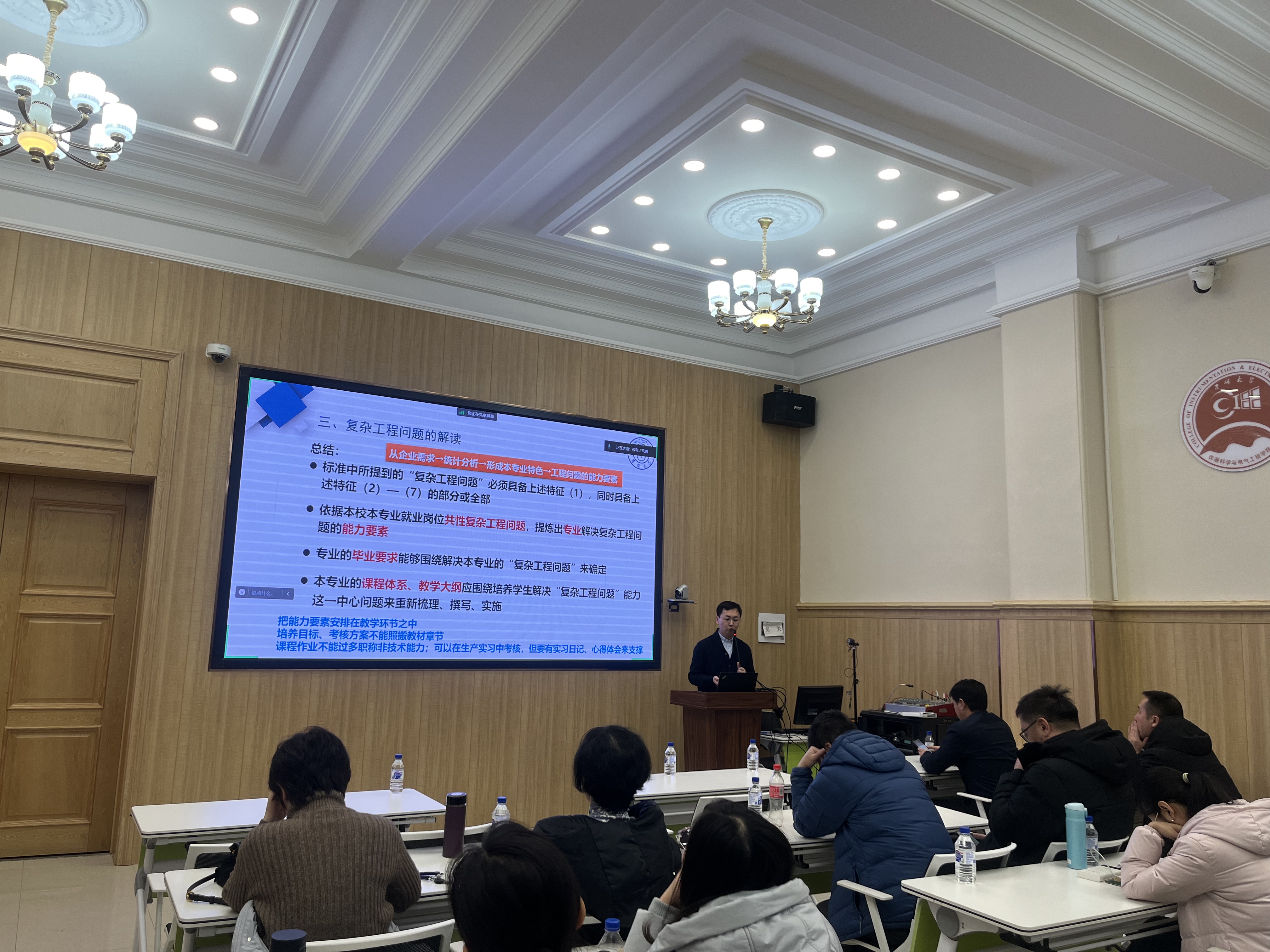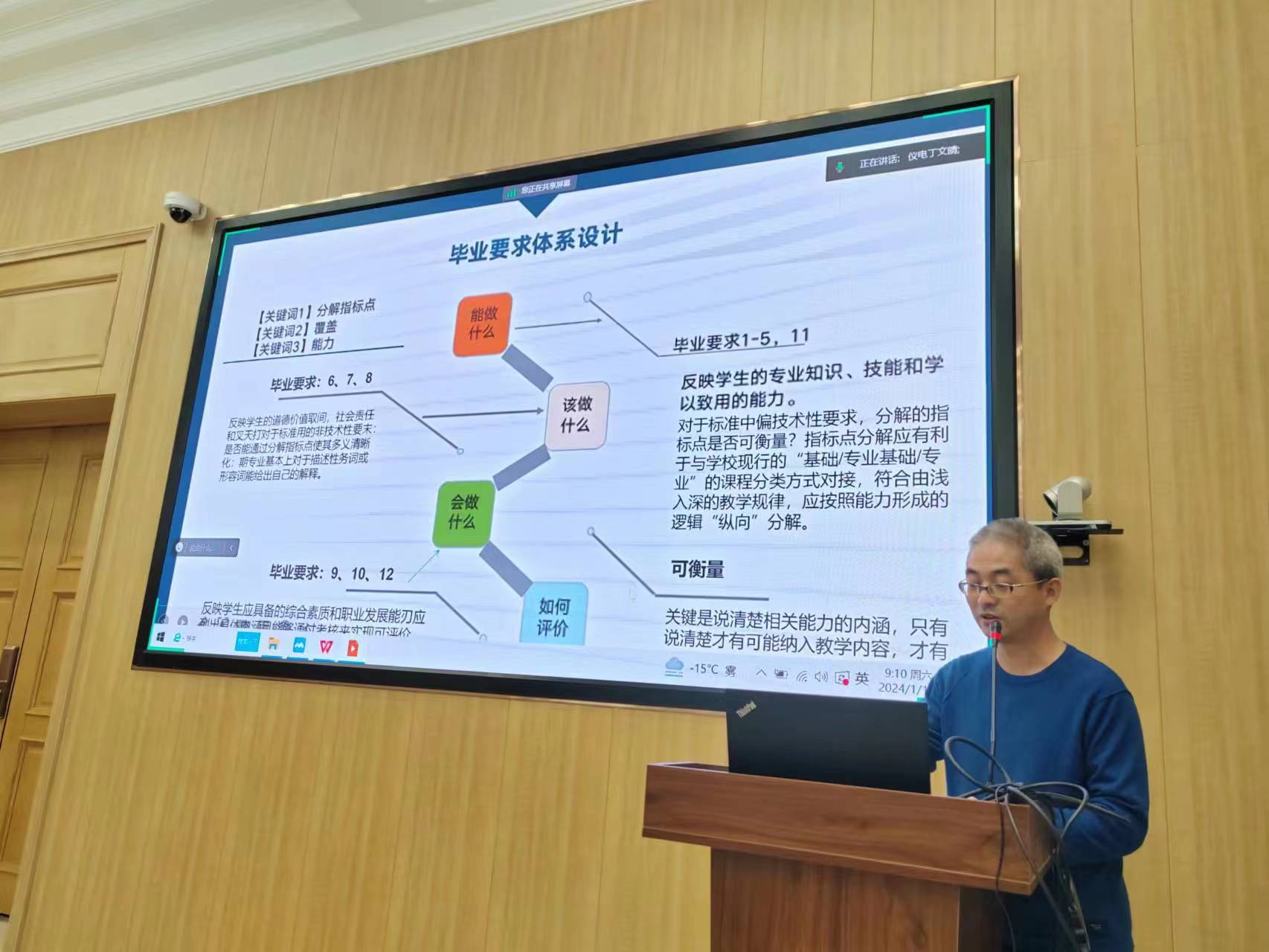 随后,朱杨老师主要介绍了复杂工程问题的教学设计,他指出,(1)要在标准和学校的实际情况之间找到平衡点,做好专业特色发展;(2)课程体系、教学大纲应围绕解决“复杂工程问题”的能力来重新梳理;(3)课程目标、考核方式也要能检验解决“复杂工程问题”的能力。高喆老师分享了自评报告撰写案例分析,详细解读了学生项、培养目标项、持续改进项、课程体系项、师资队伍项以及支撑条件项的经典案例。他强调,培养目标要公开、符合学校定位、适应社会经济发展需要,立足培养德智体美劳全面发展的社会主义事业合格建设者和可靠接班人。丁文晴老师针对专业认证的做与改进行分析,强调了专业认证要以成果为导向,持续改进。同时,牢牢把握专业认证的关键点,围绕“课程目标达成评价”和“毕业要求达成评价”,详细介绍了自评报告、申请书以及中期报告的书写要求。