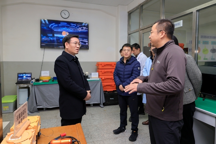 在地质宫一楼大厅,田辉参观了学院成立20周年科技成果展,考察了量子重磁传感器工艺与测试平台、地震勘探传感器研究及测试室等,听取了关于人才引进、平台建设、科研攻关和成果转化等情况的介绍。田辉鼓励学院教师聚焦星、空、地、海、井,全面服务国家战略,面向未来社会信息化、智能化需求,依托学校相关学科群优质资源及地学仪器领域优势特色,发挥深部探测与成像全国重点实验室重要策源地作用,探索高质量人才培养体系,推进高水平科学研究与成果转化,加强高层次人才队伍建设,向着深地、深海、深空等国家战略方向进军。