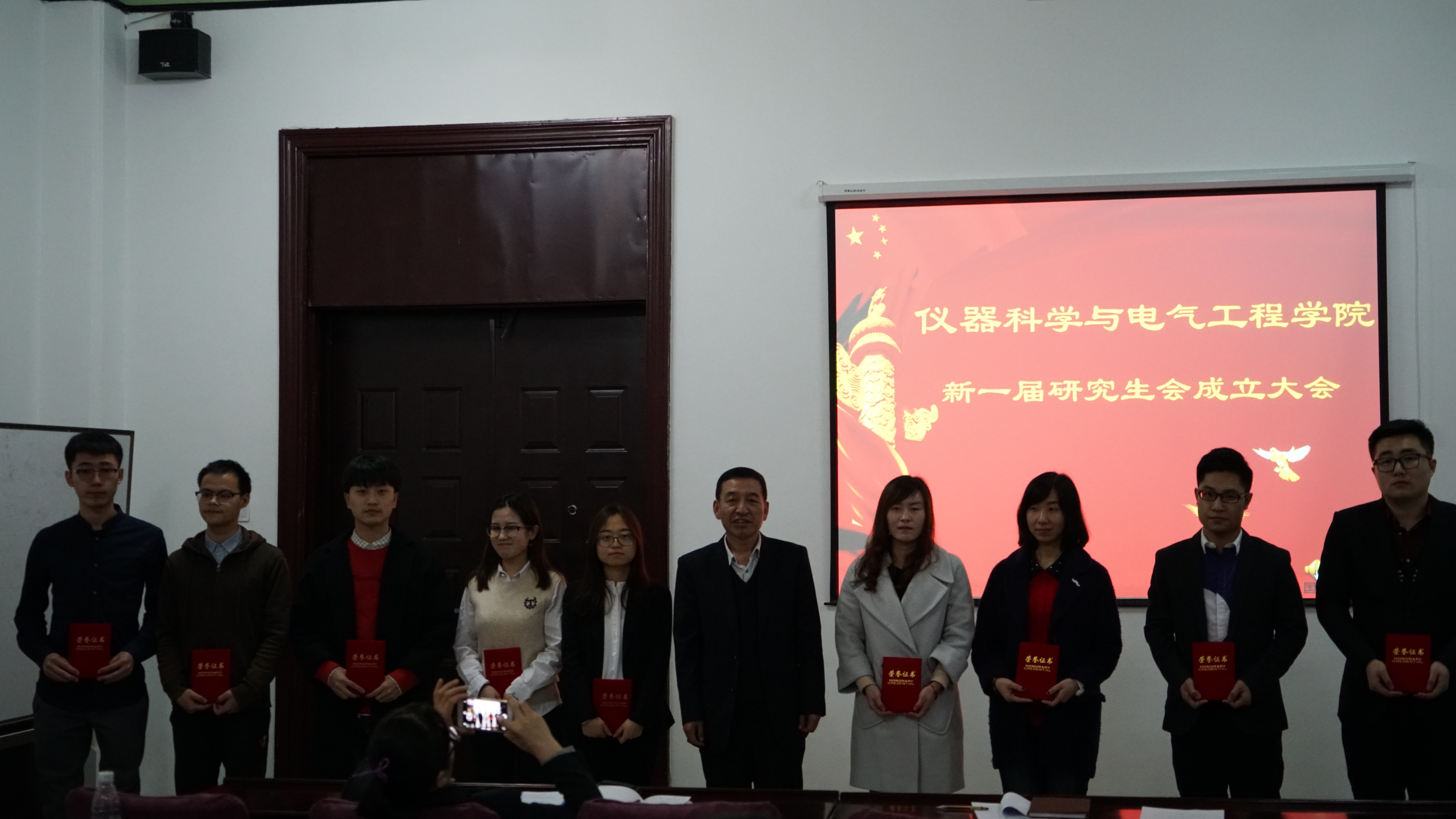 研究生工作开展中的重要性、崇高性与关键性。随后,副院长嵇艳鞠教授宣读新一届研究生会主席团成员名单,其中,任命黄维宁同学为研究生会主席,韩哲鑫同学为研究生会常务副主席。宣读完毕,嵇院长对成功当选的九位学生干部表示热烈祝贺并简单表达了自己对研究生会工作的深切期望。在王爱民老师为九位主席团成员颁发聘书后,黄维宁同学作为主席团成员代表上台讲话。话语中既有对组织信任委以要职的感恩之情,又有代表全体研究生会成员坚定锐意进取,埋头苦干品质的壮志之心,他从制度建设和活动筹划两个角度展望了今后工作,并提出了“完善自我,树立标杆”的工作追求,为研究生会工作绘制了宏伟蓝图。