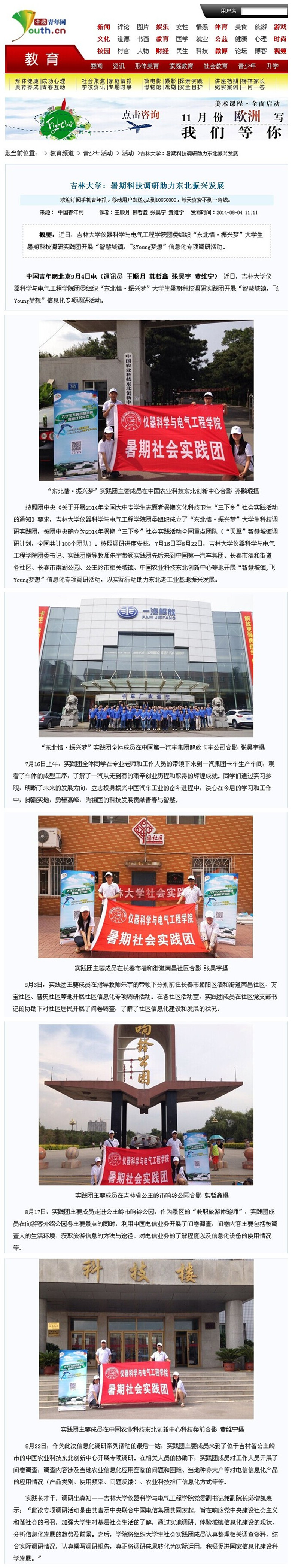 中国青年网由共青团中央主办,是国内最大的青年主流网站,也是全国大中专学生暑期“三下乡”社会实践活动官方网站。此次报道是继2014年7月11日中国青年网以《“东北情·振兴梦”吉大学子暑期科技调研实践》报道欧美无码
