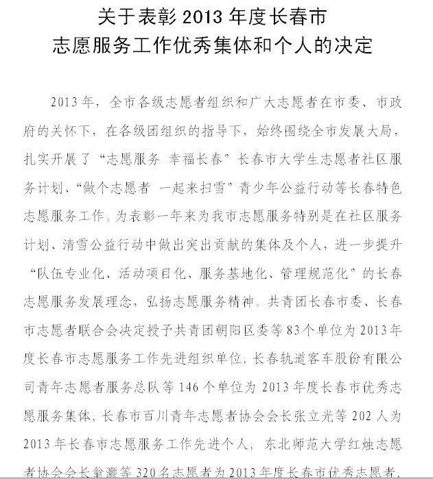 团委、“牵手”青年志愿者协会被评选为2013年度长春市优秀志愿服务集体。此外,院党委副书记兼副院长邱增凯、院团委书记朱宇还被学校推荐为2013年度吉林省优秀志愿者。