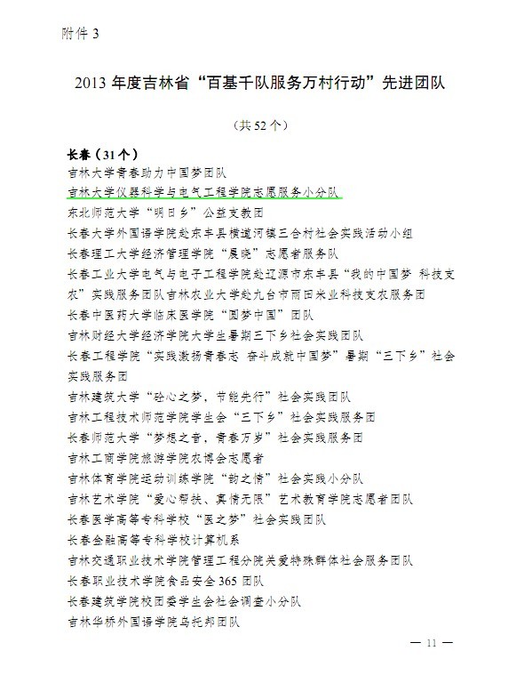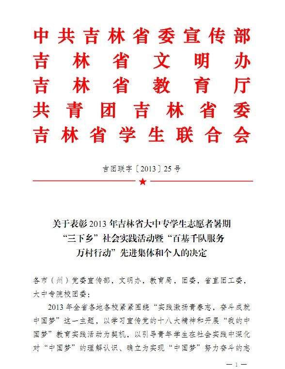 在中共吉林省委宣传部、吉林省文明办、吉林省教育厅、共青团吉林省委、吉林省学生联合会联合下发的《关于表彰2013年吉林省大中专学生志愿者暑期“三下乡”社会实践活动暨“百基千队服务万村行动”先进集体和个人的决定》中,欧美无码