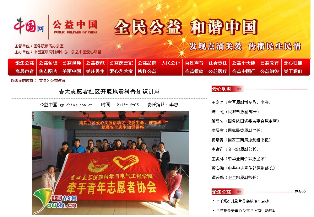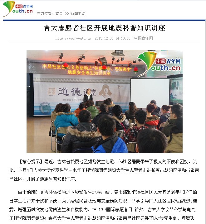 1、中国青年网《吉大志愿者社区开展地震科普知识讲座》