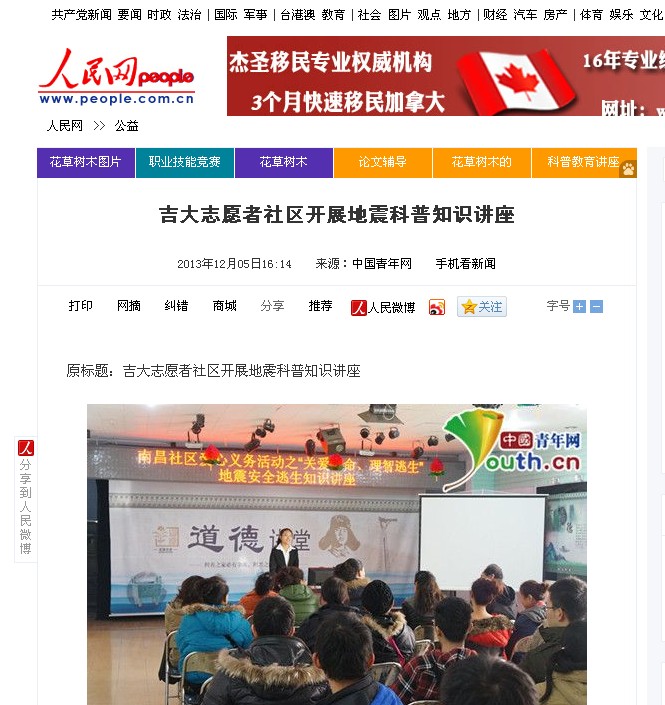 2、人民网全文转载《吉大志愿者社区开展地震科普知识讲座》