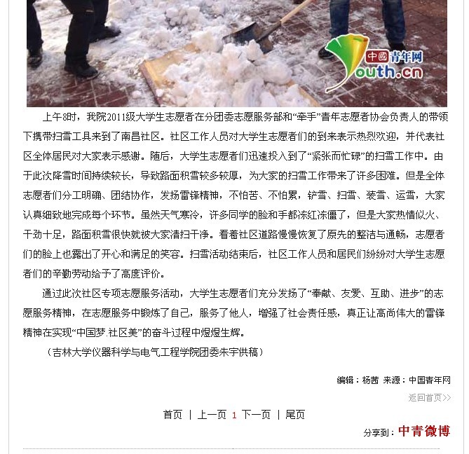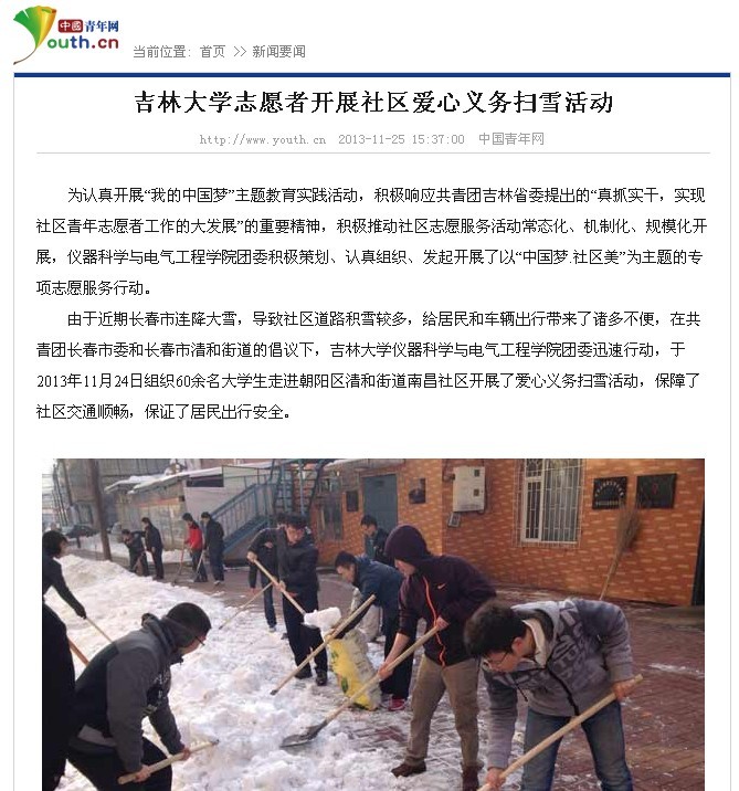中国青年网《吉林大学志愿者开展社区爱心义务扫雪活动》