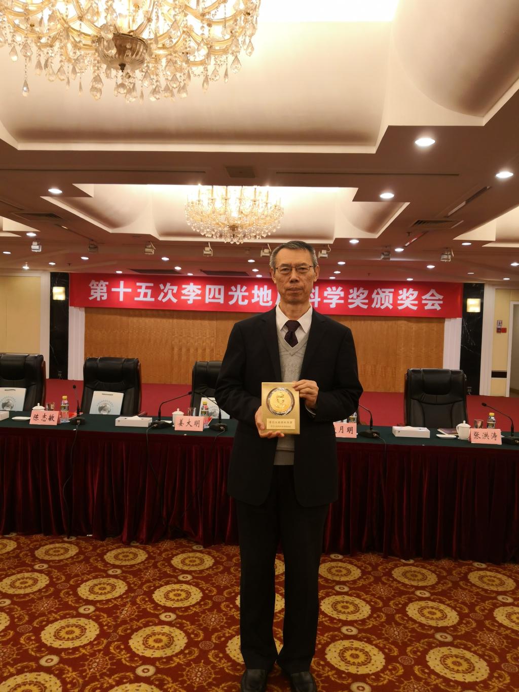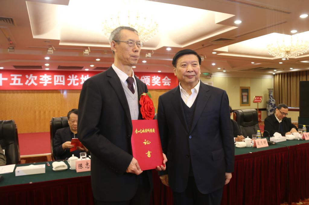 林君教授荣获李四光地质科学奖教师奖 ,姜大明为其颁奖。本次获奖的李四光地质科学奖获奖人共有15位,其中:8人获李四光地质科学奖野外奖,5人获李四光地质科学奖科研奖,2人获李四光地质科学奖教师奖。