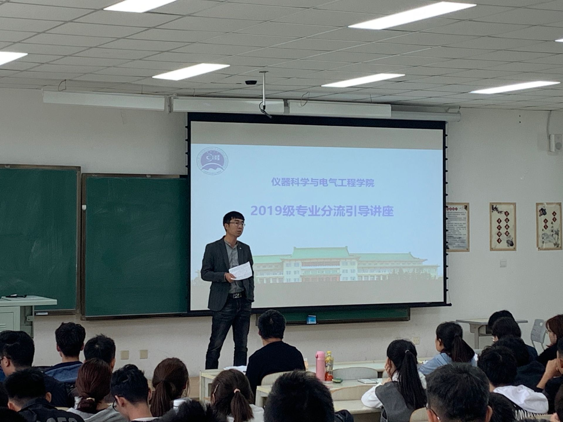 仪器类专业分流实施细则》展开解读,就细则中同学们容易忽略或存疑的问题做了细致提醒和详细说明,并多次强调本次专业分流工作的重要性。关于专业分流工作的具体实施计划,高喆老师向在座同学明确了整体工作安排和重要时间节点,向大家阐明了不同阶段学生要完成的具体任务,以保证专业分流工作顺利完成。讲座还邀请到2018级的两位优秀学生代表为大家分享经验和心得,他们结合个人经历与学习感受,在专业发展方向,未来毕业选择,保研考研形势等方面做了深入浅出的分析,从学生的角度为大家的专业选择提供宝贵建议。最后,周伟书记代表学院向同学们提出了期望,他从新中国成立后科技的发展和科学家两次归国潮谈起,引导大家思考学习的意义,他表示,希望同学们都能够为了服务社会而学习,为了人类社会文明进步而学习。