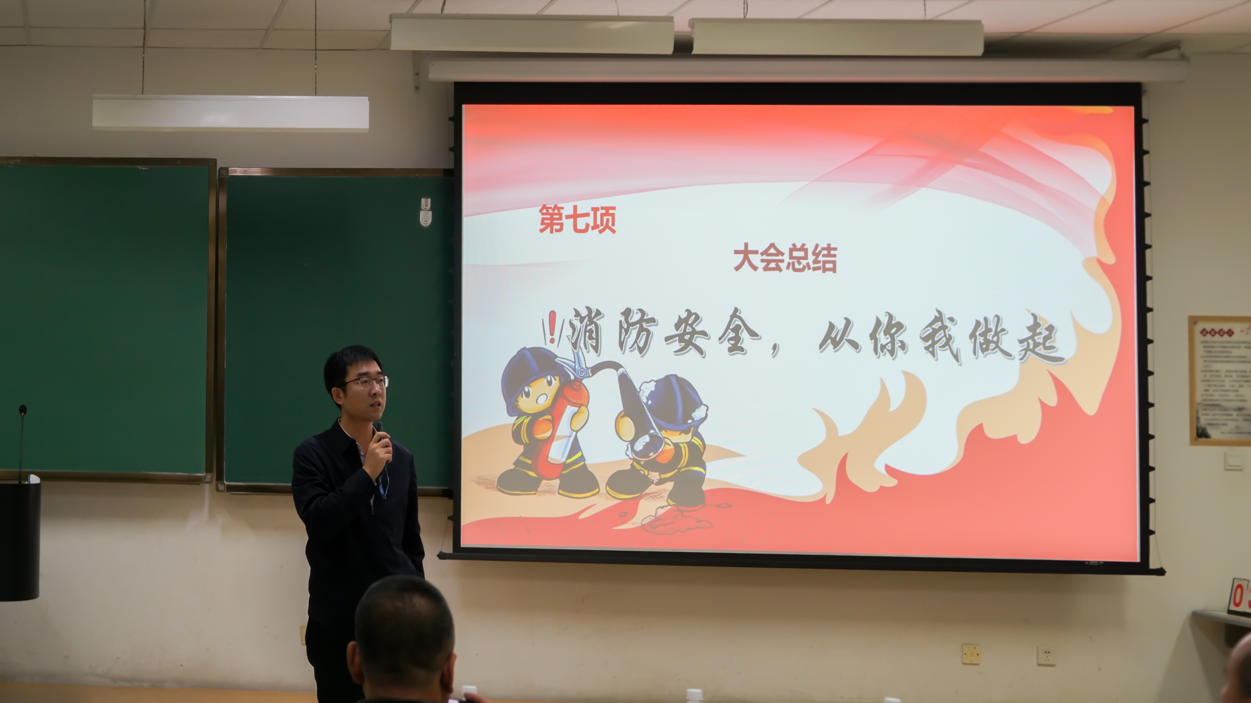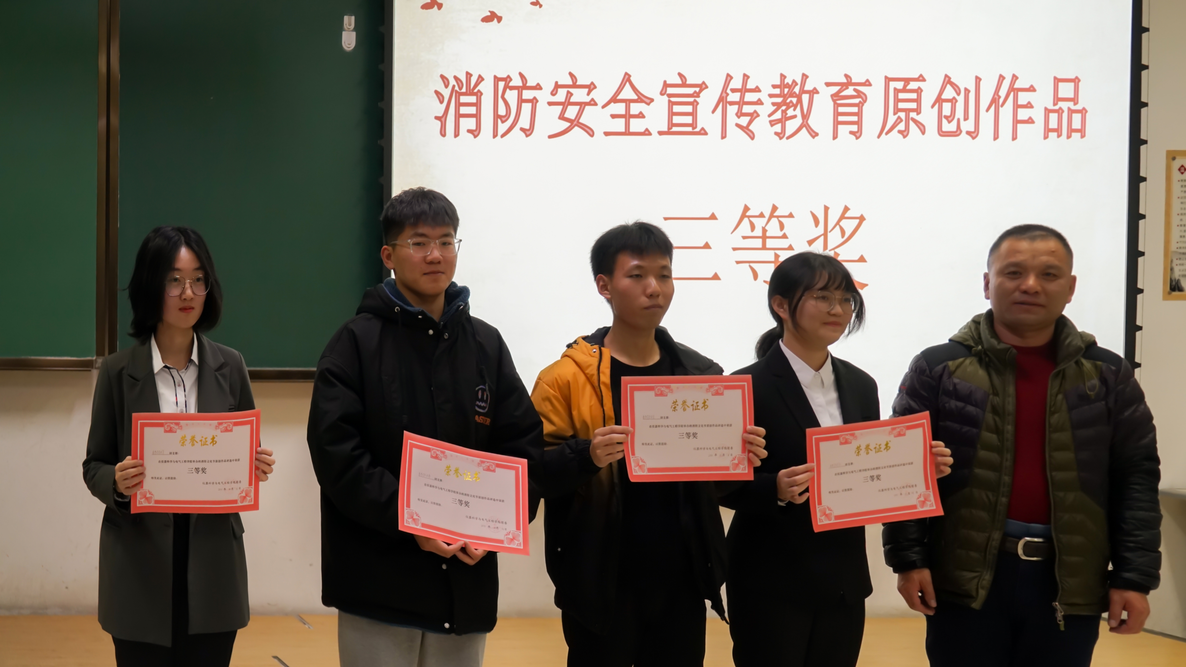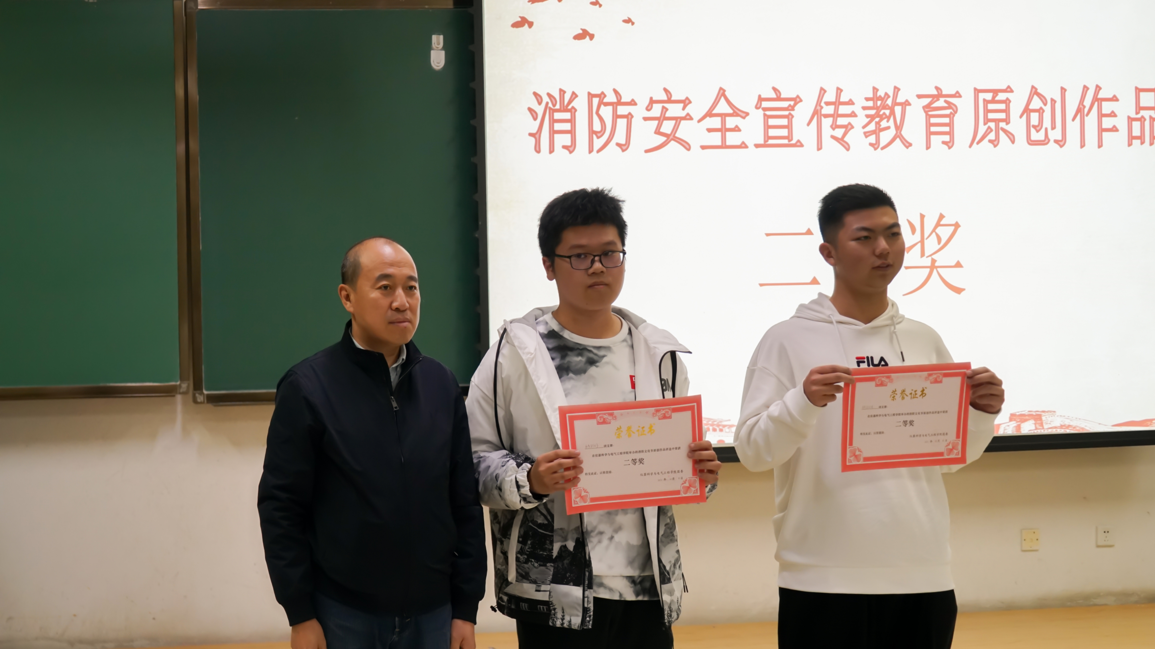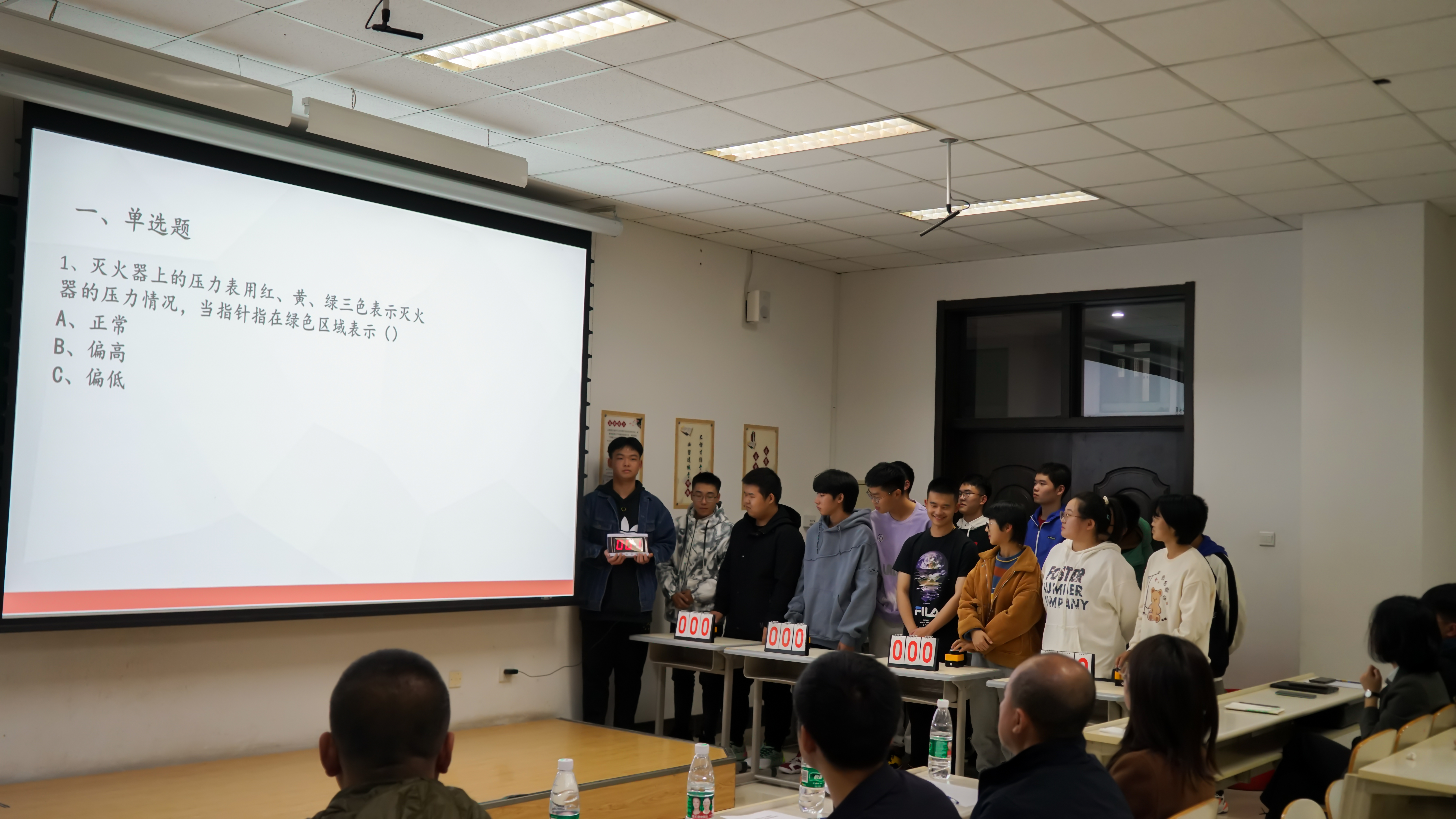 对于消防安全的重视,详细讲解了校园消防安全管理、校园火灾预防、扑救初起火灾、应急疏散演练等消防知识。接下来,21级的同学们依次上台展示消防安全宣传教育作品,作品主题鲜明、方式多样、题材丰富,从各个方面充分地阐述了消防安全的重要性,赢得了现场师生的认可和掌声。作品展示结束后,进入消防安全知识竞答环节,主持人与现场观众互动,同学们举手抢答。在第一轮中,每班的代表们踊跃回答,为班级争光,气氛十分活跃。进入第二轮的抢答个人战后,同学们也积极参与,充分展现个人实力。随后,主持人公布了本次消防文化节作品的评选结果,并由唐小兵老师、边江老师、周伟老师依次为获奖班级颁发证书。最后,周伟老师为本次活动进行总结,高度肯定了活动开展的意义,并就大学生群体与防范火灾之间的关系做出阐述,呼吁我们把消防意识深植我们心里,在日常生活中关注消防安全,共建和谐美好环境。至此,本次消防文化节活动圆满落下帷幕。