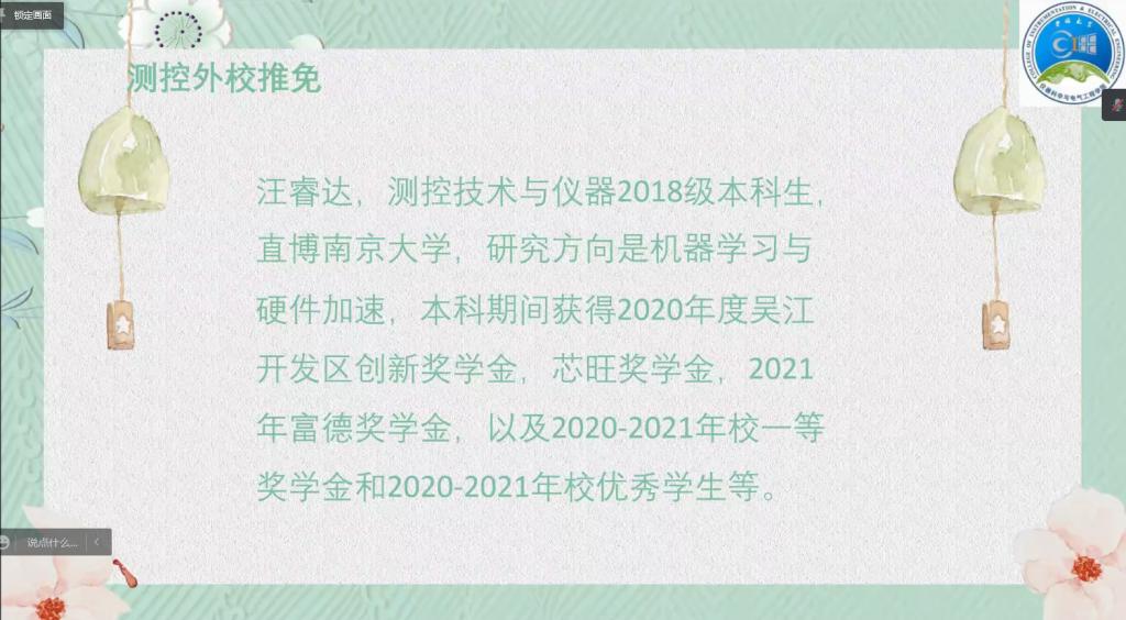 在本次交流会中,我们邀请到2018级的8位同学进行分享,他们围绕自己在测控外校推免、电气外校推免、校内直博和创新保研等方面的经历,向同学们介绍了关于推免和直博的详细流程与注意事项。分享会还邀请到直博生代表付强同学,他从大创项目的申请和结项方面进行了讲解,并对同学们可能存在的问题进行了解答。在分享后的自由问答环节,同学们积极踊跃地向学长学姐们提出疑问,学长学姐们也认真地为同学们指点迷津。学长学姐们的经验分享,为同学们在未来的道路上拨开迷雾,指引方向,让同学们在保研、直博以及大创等方面有了更多的了解,明确自己未来的方向,不断地为之努力,更有准备地、更加有自信地去面对逐梦道路上的挑战,逐步朝着目标前进,最后到达成功的彼岸。