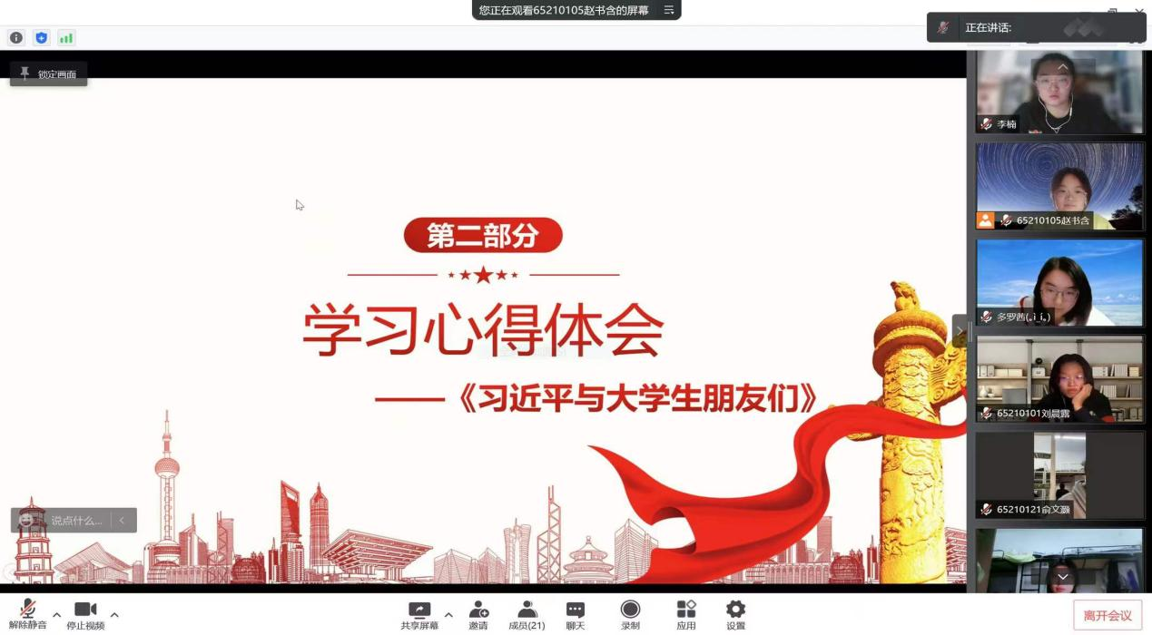 652101团支部于2022年3月26日19:30,线上开展了关于《习近平与大学生朋友们》学习分享的团日活动。分享会由团支部书记赵书含同学主持,团支部全体同学参加了此次诵读分享会。