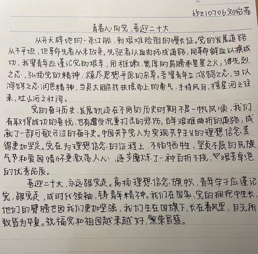 652107团支部于2022年4月13日10:00,线上开展了以《喜迎二十大、永远跟党走、奋斗新征程》为主题的团日活动。本次活动由团支部书记于海潇主持,支部全体同学参与了本次活动。