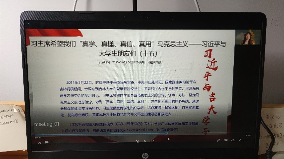 压轴环节为全班诵读,团支书徐薇同学分享了《习近平与大学生朋友们》中习近平总书记与吉大学子的故事,即“习近平主席希望我们‘真学真懂真信真用’”的相关内容,并截选部分,邀请全班同学共同诵读,30个来自祖国各地的青年声音,洋溢着同一种热血。最后,孙鹏博老师对本次活动表示肯定,并鼓励大家牢记领袖教诲,在如今的封寝生活中保持积极向上的心态,潜心学习,励志图强。