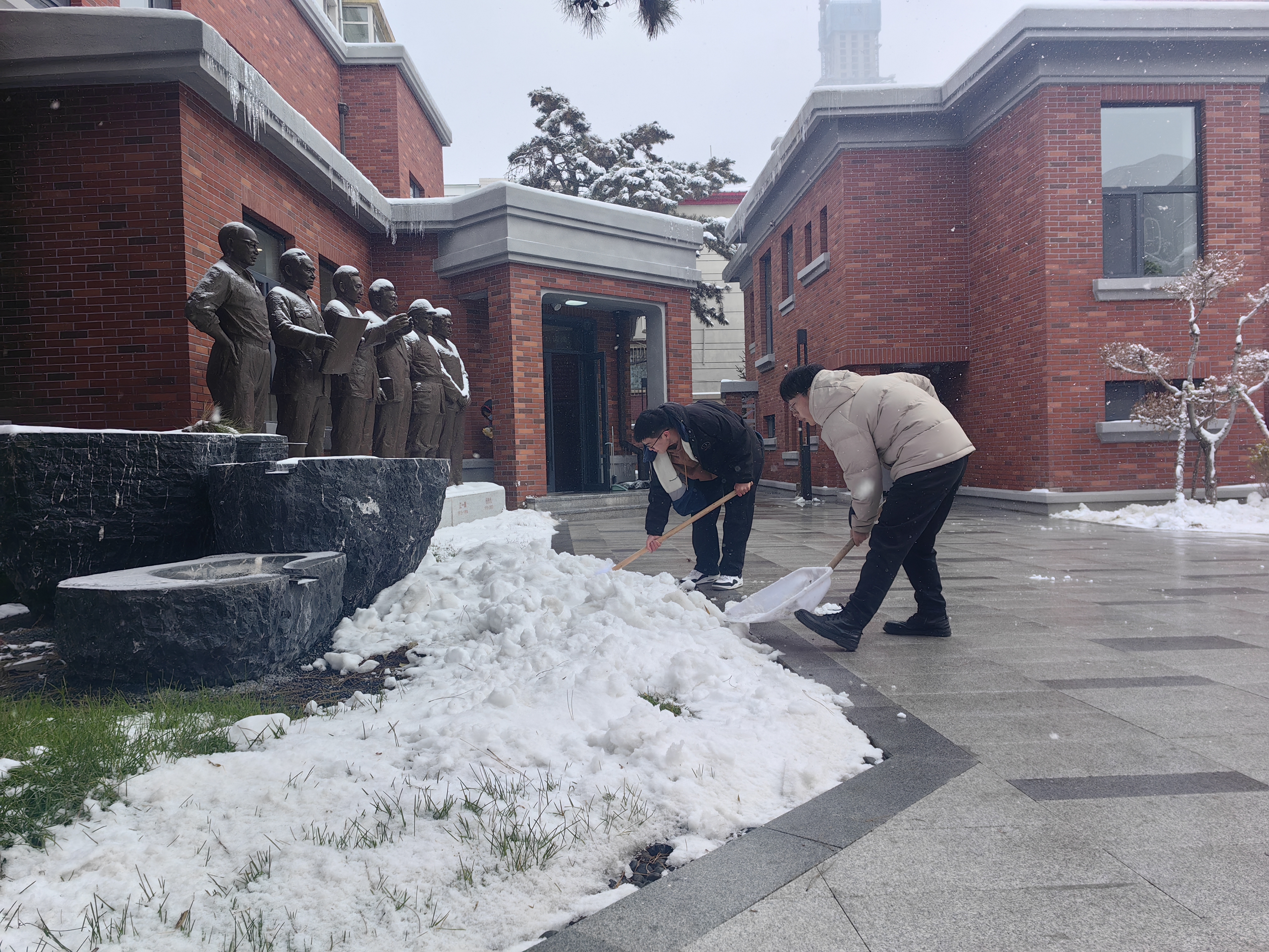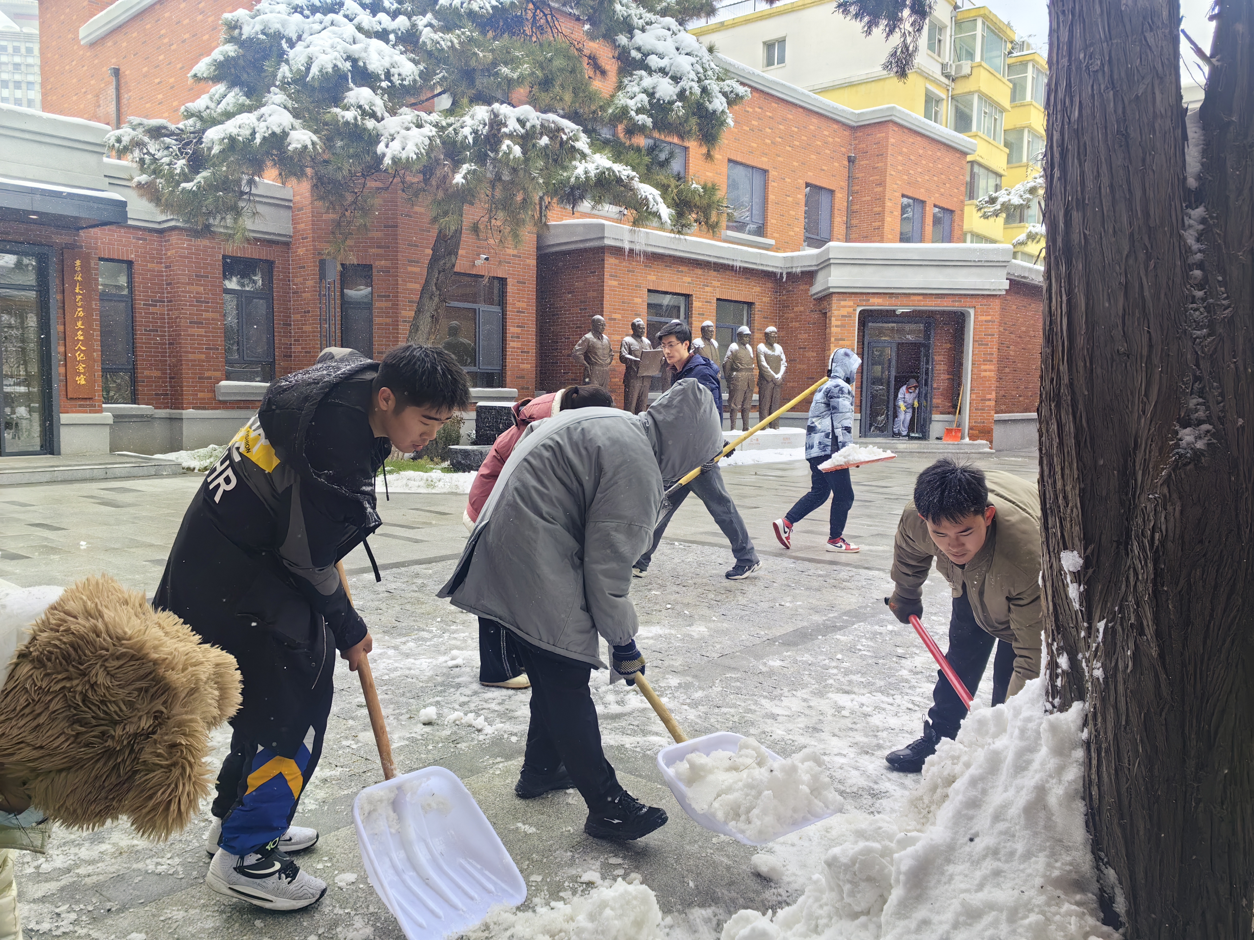 牵手志愿者协会成员在孙鹏博老师的带领下来到吉林大学历史名人纪念馆,开展义务扫雪活动,保障参观师生的出行安全。