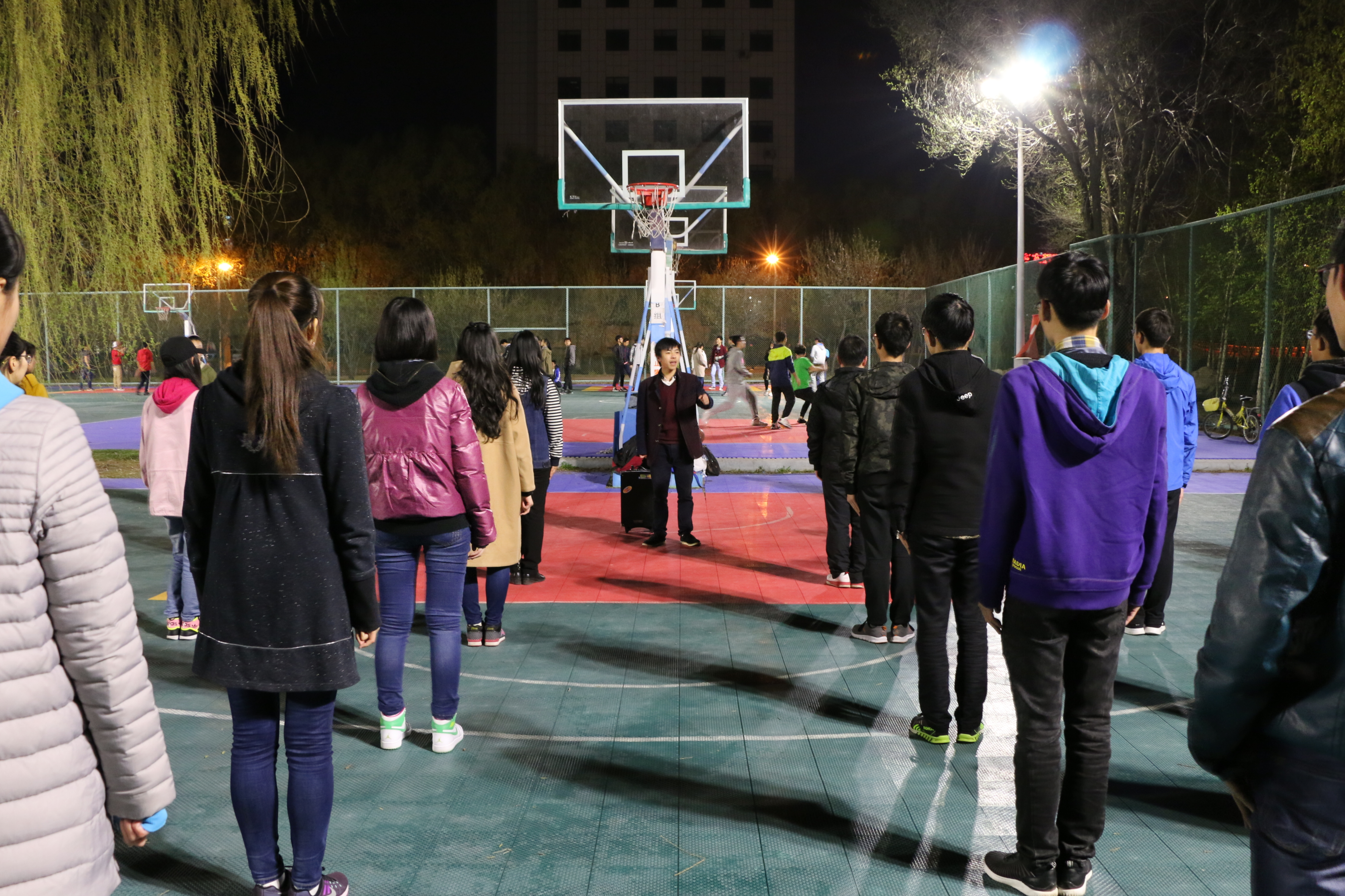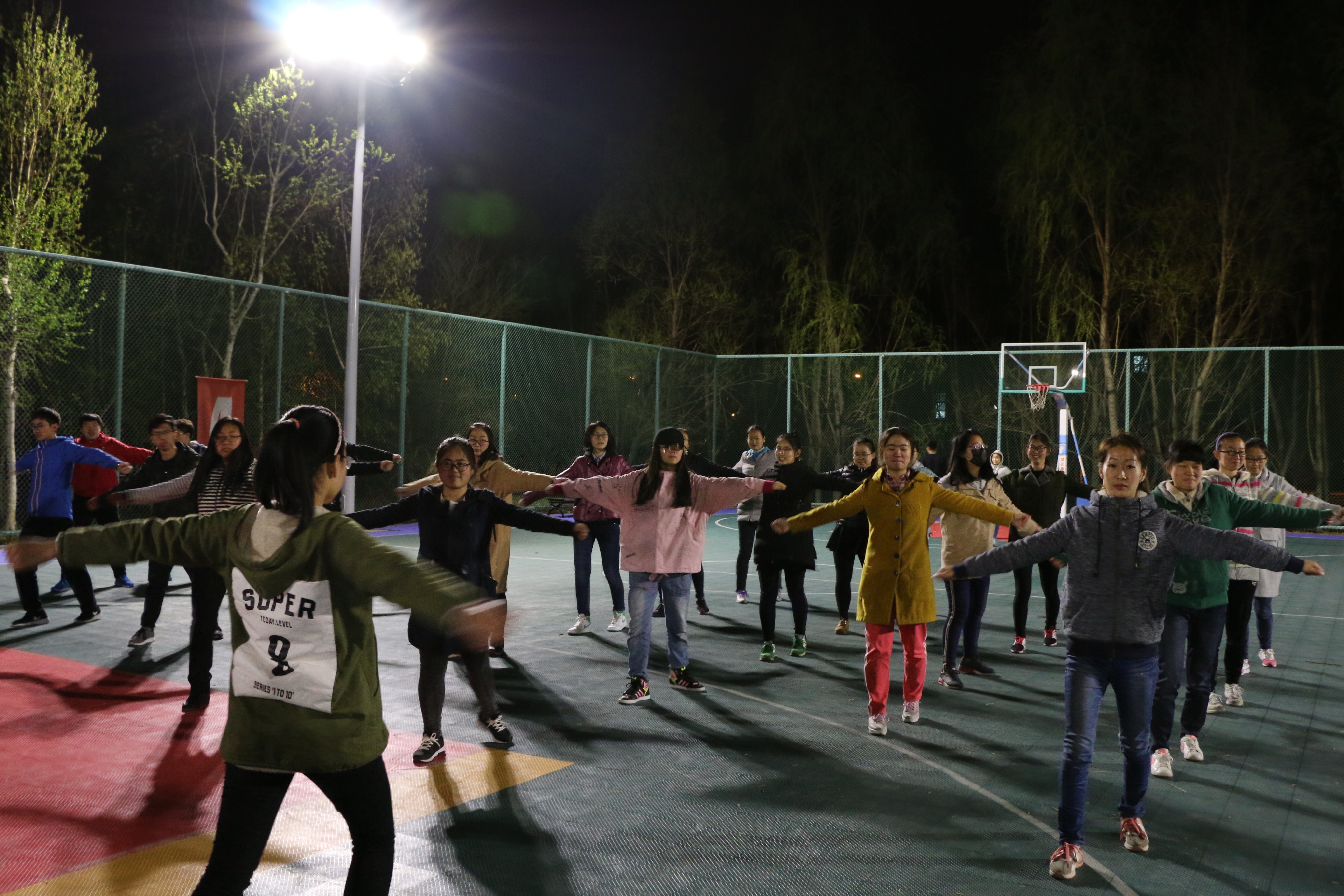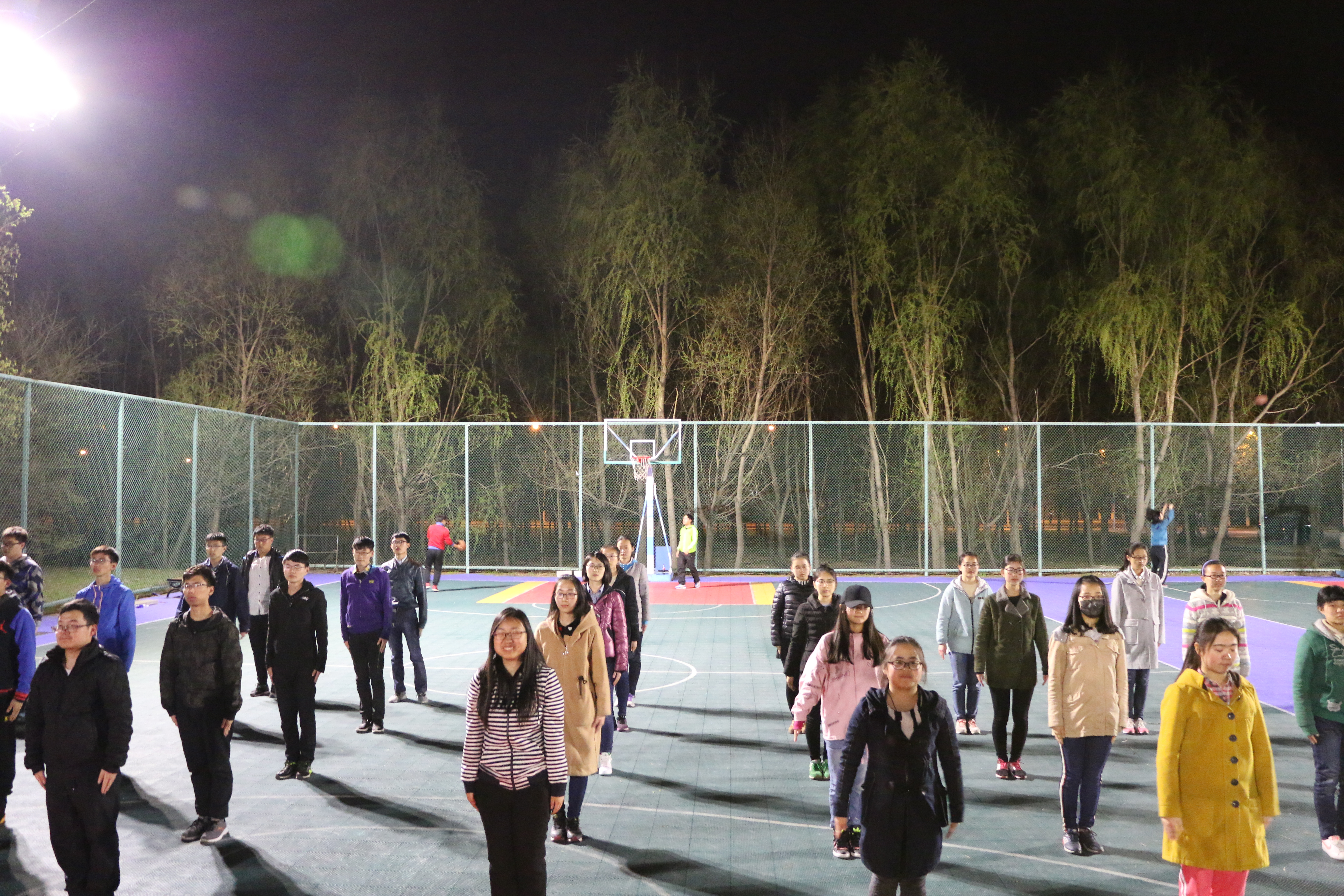于2017年4月27日晚9:20在体育馆东侧篮球场展开广播体操的训练工作