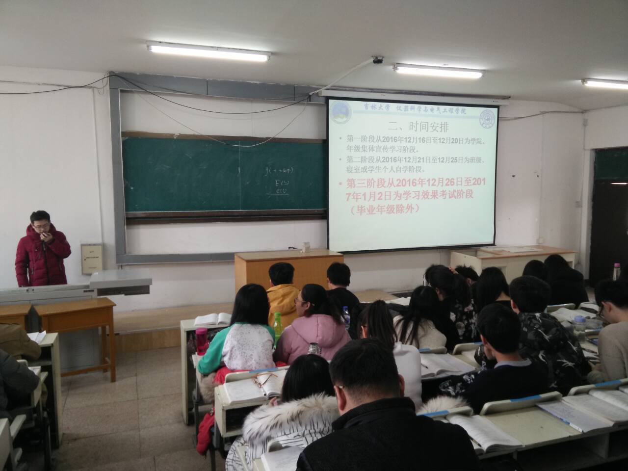 在水宫楼518教室召开年级大会,组织2014级全体同学学习新版《吉林大学学生手册》。会议由651402班班长陈健主持。会议伊始,陈健同学对新版《吉林大学学生手册》内容向大家进行了简单介绍。接下来,组织同学们对校规校纪、校园安全、奖惩制度、校外居住、公寓管理、大学生医保等学生手册重点内容进行学习,并以随机提问的方式督促大家学习,加深对内容的理解记忆。