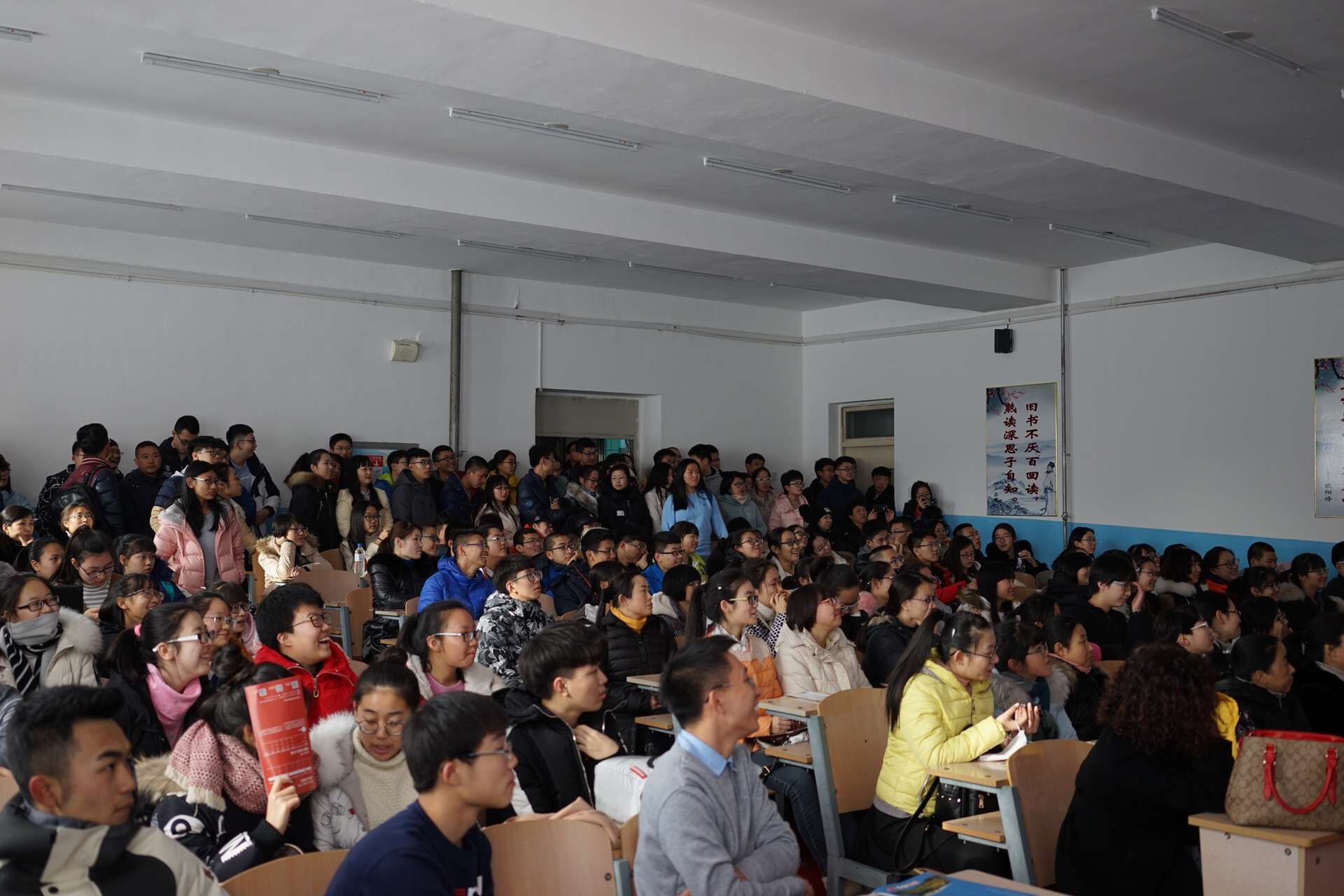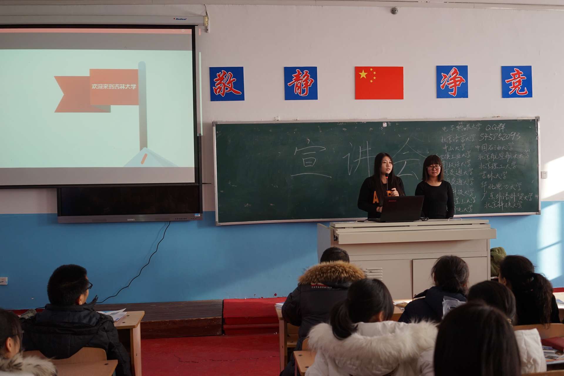 在2月13号中午12点,周帅宇同学及其团队成员来到四平市第一高级中学南楼一楼阶梯教室,在此之前他们已经联系好学校广播站为其宣传,同时在学校的显著位置张贴了海报。由于成功的前期宣传,致使去听讲宣讲会的学生与家长非常多。活动由主持人协调现场,主持人也是实践团队一员,在别的高校校友介绍完他们的学校后,吉林大学的宣传员也开始上场宣讲了。他们为学子们讲述了吉林大学历年的招生录取分数线和吉林大学各校区的美景,同时也介绍了具体的几所学院,更加详细的让学子们了解吉大,流利的语言,精美的PPT展现了吉大学子的精神风貌,获得了同学们的高度认可。