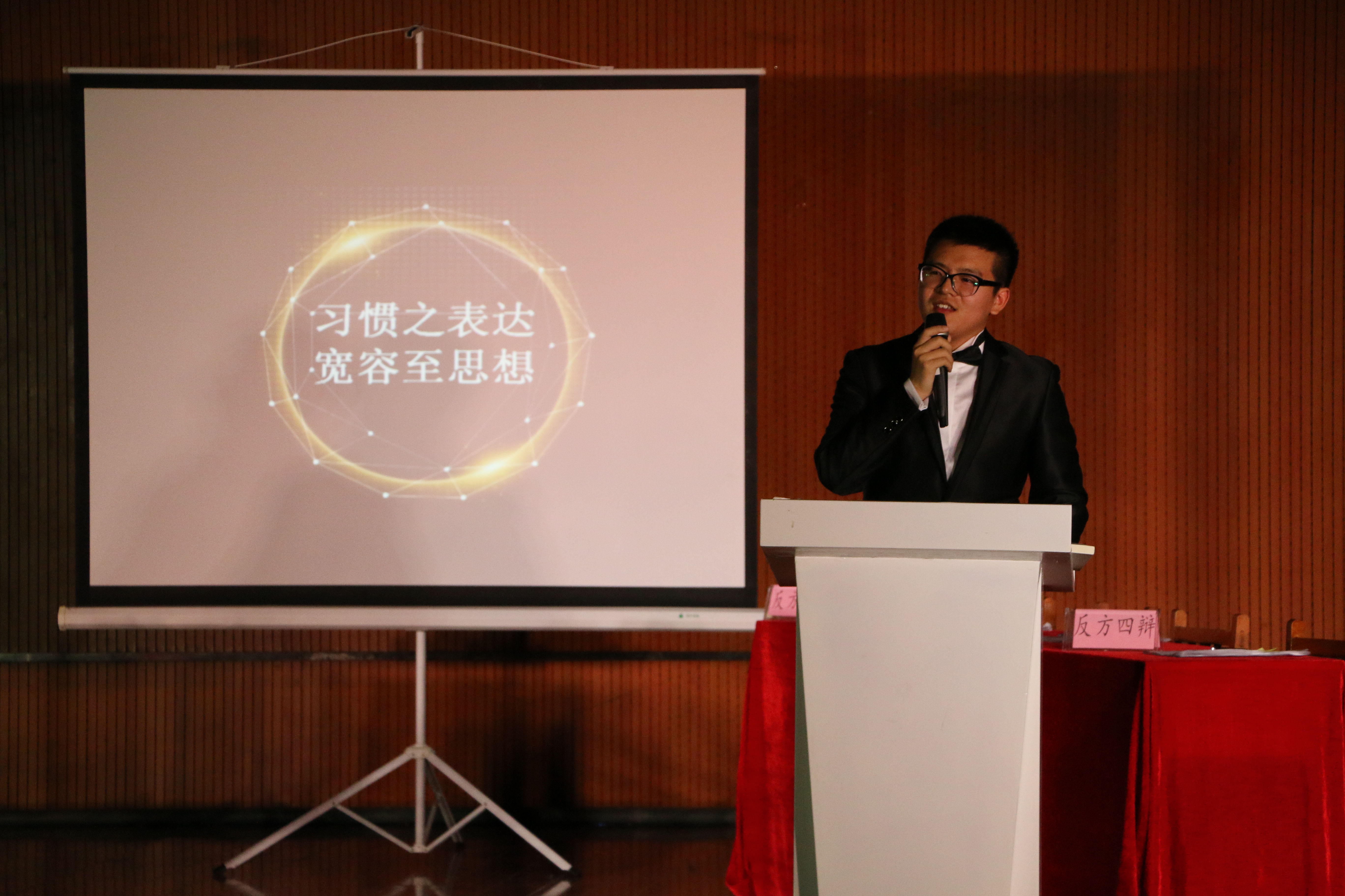 15级1班马松辰同学带着一句经典的“风声雨声读书声,声声入耳;家事国事天下事,事事关心”登上演讲台。配合简洁明了的幻灯片,他用生动的语言,丰富的例子向大家依次讲述了“广博之阅读,深邃至灵魂;焦虑之思考,自由至信仰;习惯之表达,宽容至思想;无限之分享,人文至创意;豁达之尝试,恪慎至责任”的社团拓展理念,倡导当今大学生广泛阅读,多思考,多交流,明确自己的责任与担当,同时也用肺腑之言表达了自己和团队创立社团一路走来的心路历程。最后,马松辰同学引用雅思贝尔斯在《什么是教育》中的一段话:“精神贵族是从各阶层中产生的,其本质特征是品德高尚、个体精神的永不衰竭和才华横溢,因此精神贵族只能是少数人,大学的观念应指向这少数人,而芸芸众生则在对精神贵族的憧憬中看到了自身的价值。”作为宣讲的结束。