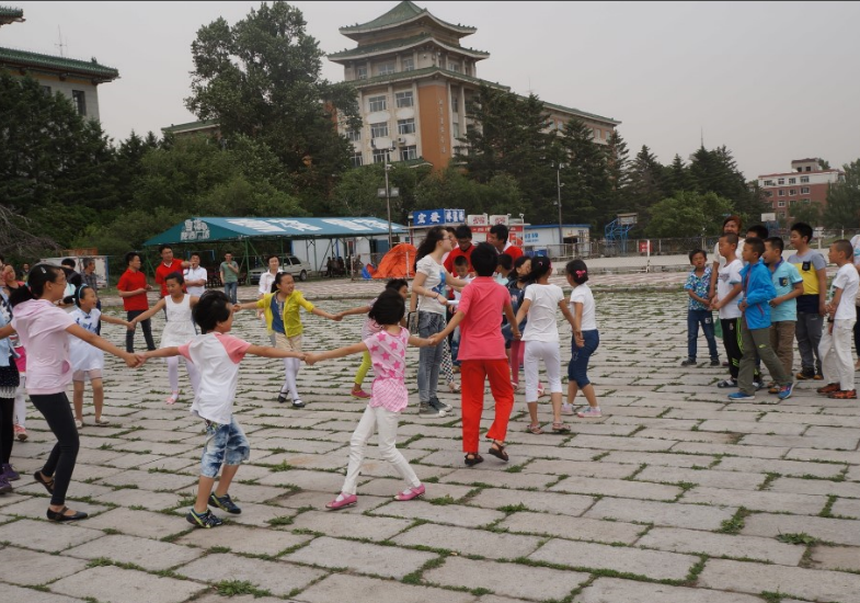 团委联合长春市清和街道办事处带领35名外出务工农民工子女,在参观完仪电学院216+开放实验室后,带着他们来到文化广场开展益智游戏。