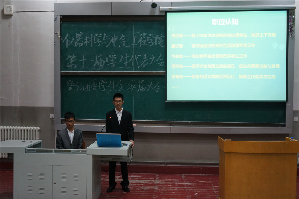 大会在轩昂壮阔的中国共产主义青年团团歌声中拉开序幕。此次大会首先审议并通过了第十届学生会主席李昊阳同学代表分团委、学生会进行的工作报告,回顾了一年来第十届分团委学生会的工作历程。对这一年来取得的成绩予以展示,同时深刻反思并陈述各方面工作的不足。随后,院团委书记兼2012级辅导员蔡印老师为第十届团学组织主要学生干部颁发了任职证书。证书颁发仪式结束后,学院第十届分团委副书记付博同学宣读了第十一届团学组织主要学生干部候选人名单,随后候选人依次上台演讲竞职。候选人们结合演示文稿陈述了自己的竞选理由和个人优势、组织和岗位认识以及任职后的工作构想,精炼而自信的演讲赢得了与会人员的阵阵掌声与赞叹。演讲完毕后各学生代表依次上台公开投票,民主选举产生新一届主要学生干部。最终,2013级于一兵同学当选第十一届分团委第一副书记,岳良广同学当选学生会主席,穆怀志、侯雪征、任晓闯当选分团委副书记,樊毅尧当选学生会副主席,大会还选举产生了分团委、学生会各部门负责人及科技协会、“牵手”青年志愿者协会、新闻通讯社等学生组织相关负责人。随后,2014级何宗泽同学宣读了倡议书,倡议团学组织的学生干部们认真工作,兢兢业业为同学们服务,为欧美无码