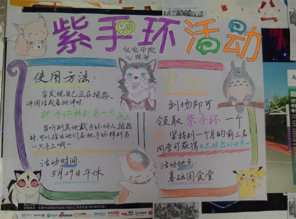 心理部副部及部员在李四光二楼的展板上张贴了关于此次活动的海报,海报上标明了紫手环的使用方法及活动的时间和地点;5月28日课间,活动人员在李四光教学楼中的黑板上写明了紫手环活动的时间、地点、举办学院、具体内容以及奖品情况;28日晚,心理部全体部员进行了走寝宣传,通过一系列的前期宣传工作,让更多同学了解紫手环活动,引起同学们的兴趣。虽然心理部的同学们为了海报的设计绞尽脑汁,为了此次活动的宣传牺牲了课余休息时间,但同学们仍洋溢着幸福的笑容,丝毫没有抱怨和疲惫。