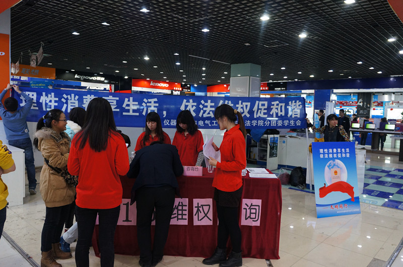 青年大学生连同法学院志愿者分四路分别来到长春市百脑汇科技大厦、长春市红旗街万达商场、吉林大学中心校区三食堂、吉林大学朝阳校区男女寝门口展开消费者维权活动。志愿者设立了咨询台,帮助市民进行相关申诉和举报,解答市民的维权疑问,与市民进行维权法律常识的交流。在整个交谈过程中,志愿者发现,消费者的法律维权意识需要普及深化,消费观念需要绿色环保。最后,志愿者在各个活动现场举行了签名仪式,所有志愿者邀请前来参与活动的市民在横幅上签名并写下大家在消费维权方面的美好愿望或建议,增强大家对消费现状以及消费者维权保护方面的信心。