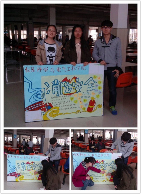 分团委、学生会准备的消防安全宣传板上留言,“校园安全人人有责”、“安全的生活与学习,需要学校和同学的共同努力”、“消防知识记我心,校园安全靠大家”等等,都表现出同学们强烈的消防安全意识。
