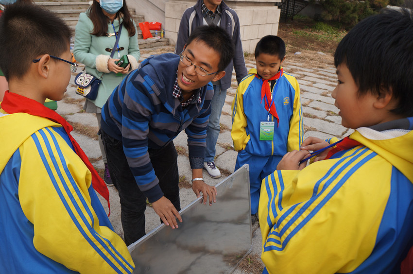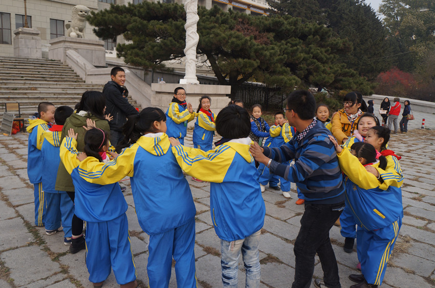 大学生志愿者们带领来自长春市西安小学的64名农民工子女在文化广场地质宫门前开展了沟通传递爱心,周末圆梦大学”素质拓展活动。