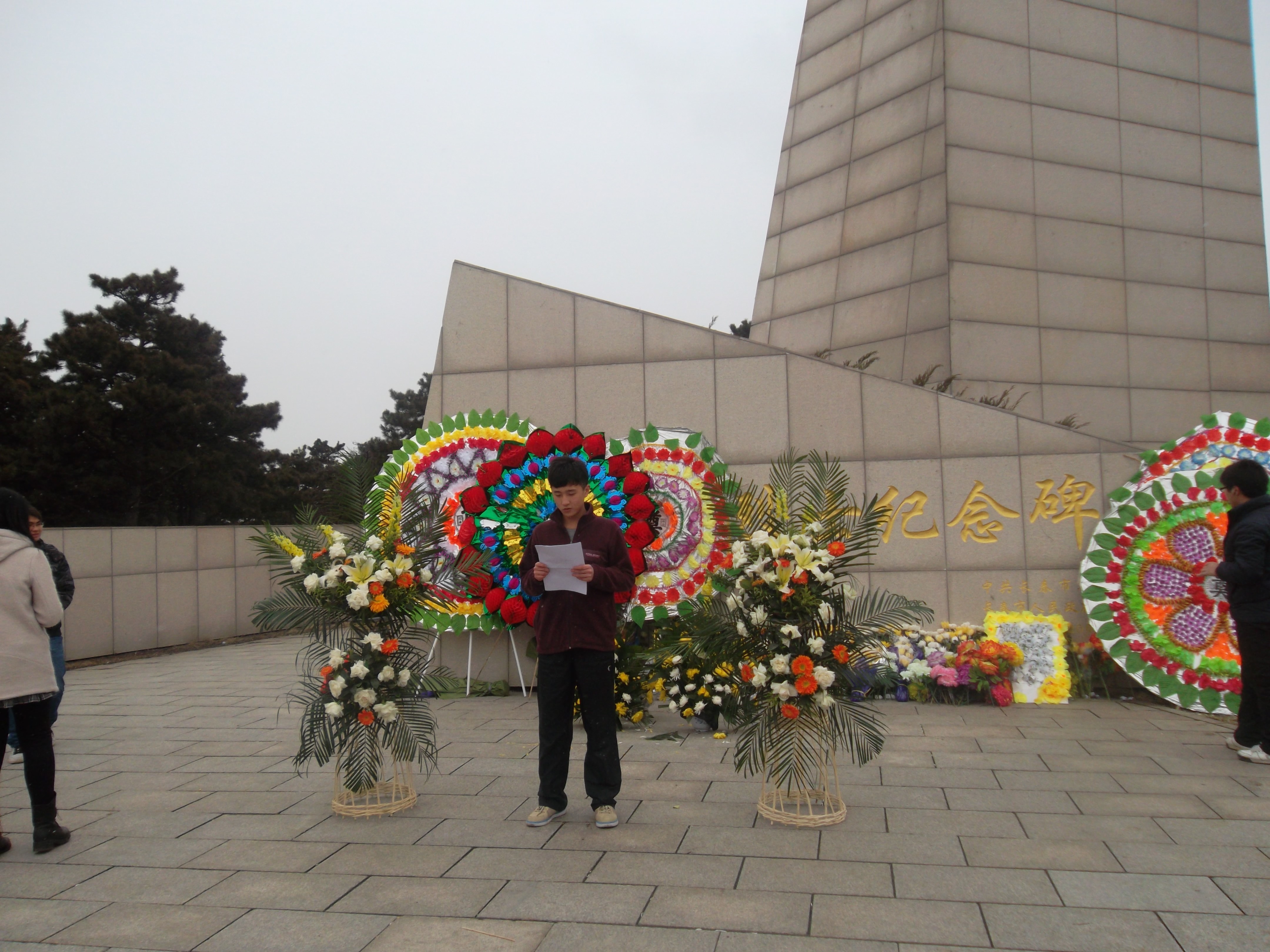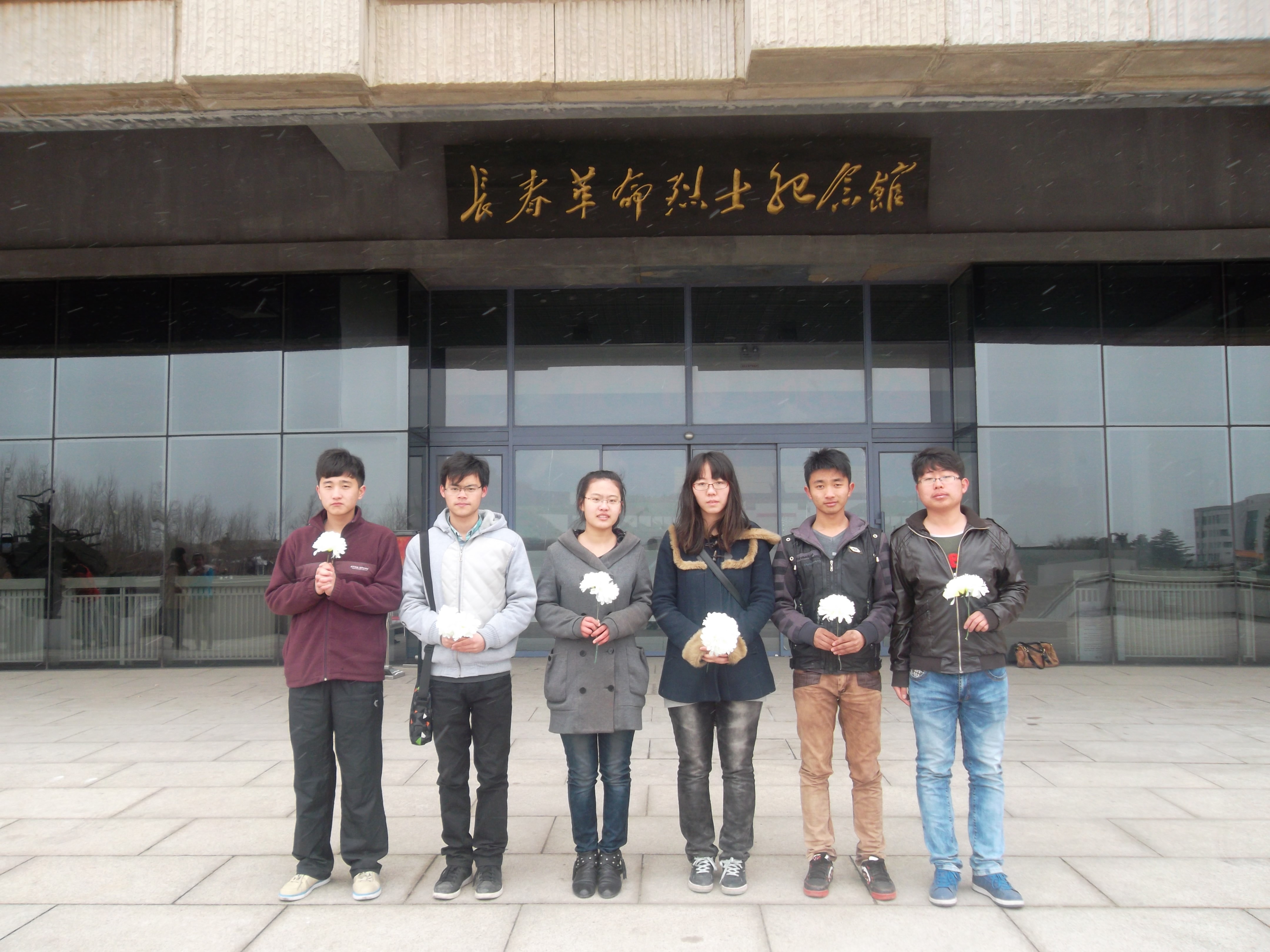 院旗来到长春市九龙源烈士公园。首先,学生代表们向革命英雄敬献承载了崇敬之意的花圈,接着全体同学为烈士默哀三分钟,以表达对先烈的无限哀悼之情。之后,学生代表姜鹏致献悼念词,悲伤及崇敬的声音在纪念碑前久久的回荡,哀痛的言词表达了对英灵已逝的无限伤怀。随后,同学们参观了抗美援朝纪念馆,对烈士的事迹进行了学习和了解。那泛黄的书信、生锈的武器、悲惨的照片无不栩栩如生地显示出当年战争的残酷和革命先烈们为解放而做出的重大牺牲,“誓死不做亡国奴”的铮铮誓言在今天仍激励着中国人民奋勇向前。走出纪念馆,同学们瞻仰了公安英烈广场,向英烈公墓敬礼。最后,全体同学在革命烈士纪念碑前合影,纪念活动顺利结束。
