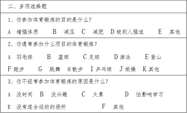 从调查结果可以看出,普遍受欢迎的体育项目是篮球、足球、羽毛球和跑步。但是大部分同学没有自己的体育锻炼计划,很多都只是随机安排自己的体育锻炼活动。对于参加体育活动的目的,同学们认为主要在于增强体质,同时也有为了缓解压力和减肥等。从这次征集活动中,我们还了解到在体育锻炼方面,女生的参与度相对落后于男生,建议广大青年女同学在未来的大学生活里积极参加课外活动和体育锻炼,增强体质。