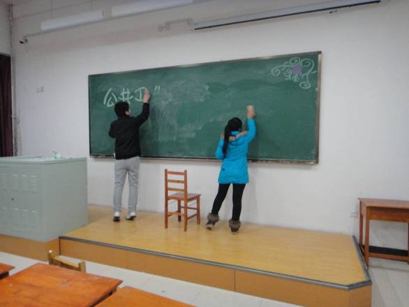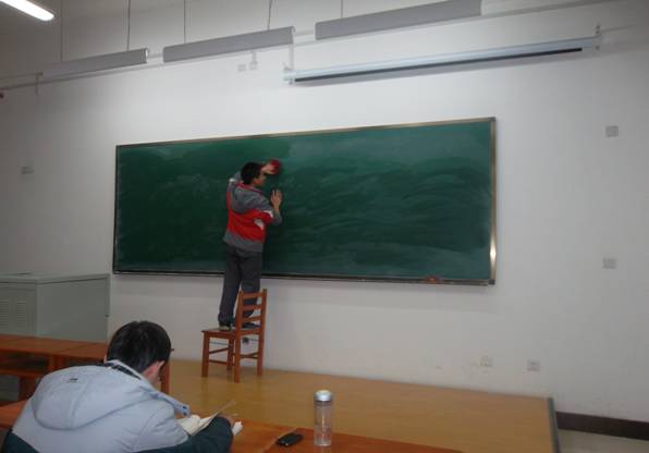 所有的2012级学生志愿者在这一周的时间里每天都会在21:30时在李四光楼二楼、三楼进行志愿服务活动,把每个教室的黑板都擦干净,桌椅都摆放整齐,使老师们能够更方便的教学并给同学们营造一个更为舒适的学习环境,活动期间由2011级同学带队,带领12级志愿者们收拾每一间教室,虽然很累,但是大家脸上一直洋溢着微笑,积极认真的参与活动,干净利索的完成了所有任务。有的学生志愿者说:原来一直苦于没有进行志愿服务的机会,原来这些机会就在我们身边,我们做的事真的可以让大家开心快乐!