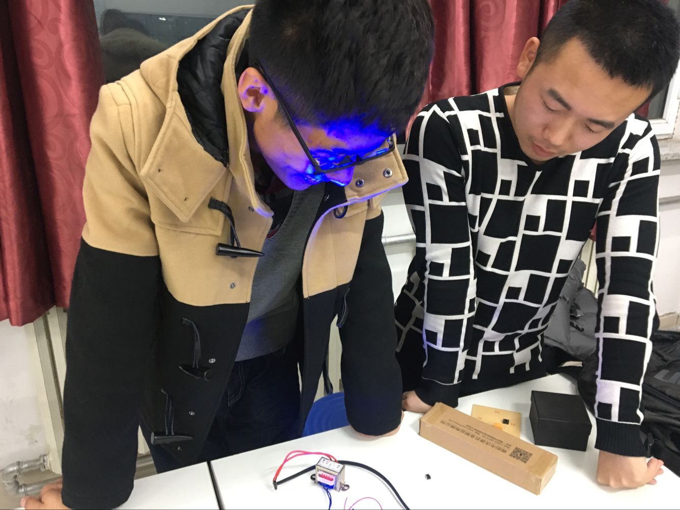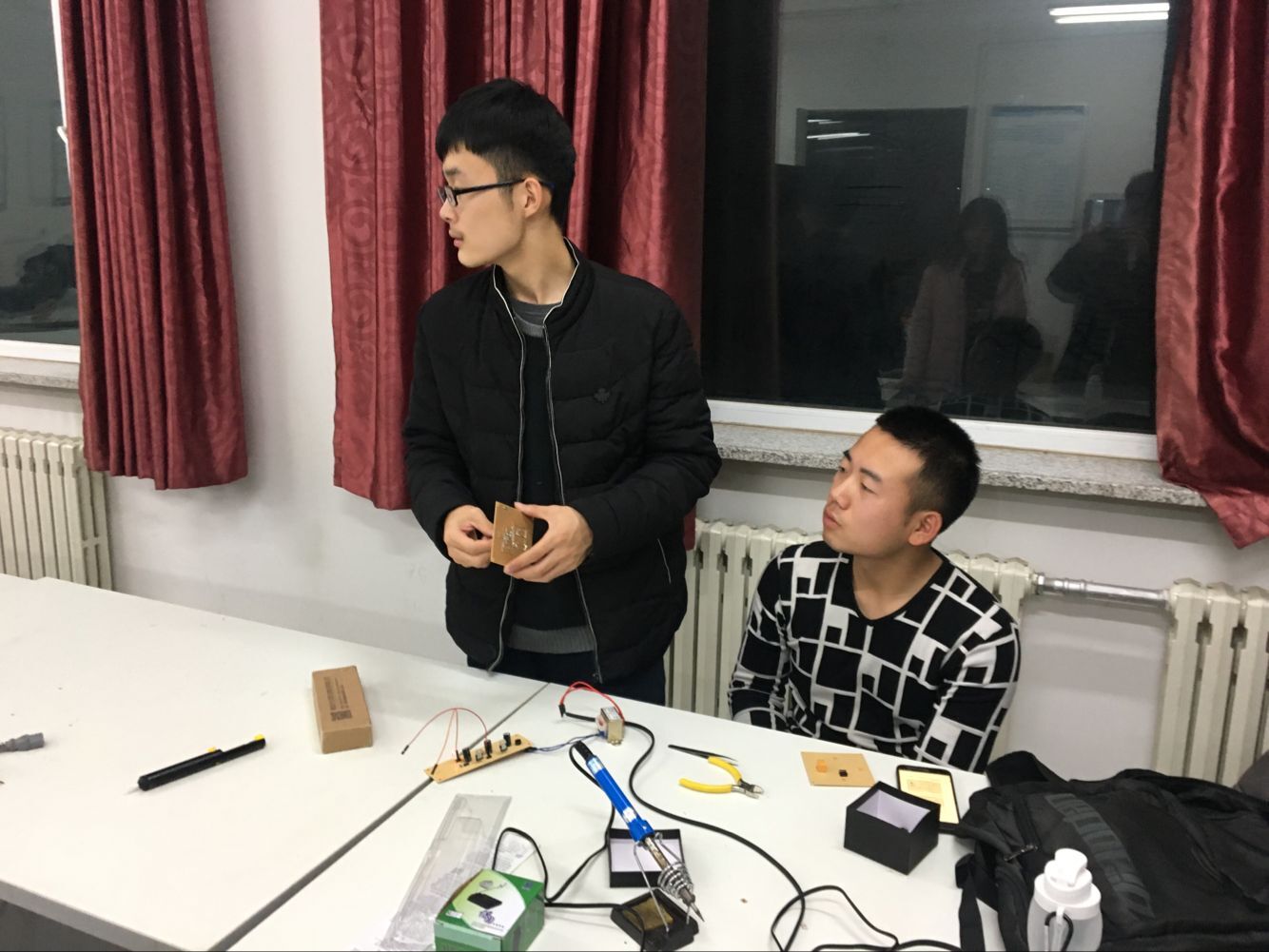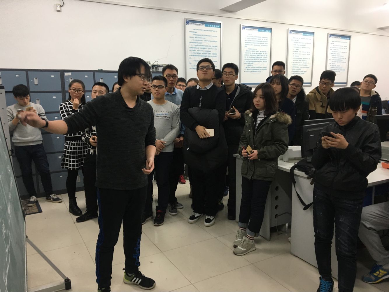 科协会长龚善超同学、副会长张博森同学及各位副部组织了此次培训。首先张博森同学在447实验室以授课形式向同学们讲述了红外感应出水器硬件电路的工作原理,对各元件的使用及其注意事项进行了详细的讲解,并回答了同学们在焊接过程以及理论理解上的一些问题。张博森同学热情洋溢的讲解赢得了大家热烈的掌声。接着,多位2016级216+实验室成员一同对同学们的作品进行了检查,同时对同学们在焊接过程中出现的一些问题做出了指正,并协助同学们进行了修改。最后2017级新生被分为两组,分别前往405、447实验室,由科协2016级同学对他们在焊接时出现的各种突发状况提供了面对面指导。2017级新生聚精会神地坐在桌子旁焊接电路,遇到不懂的问题积极向高年级同学请教。经过三个多小时的培训,很多同学自主完成了焊接,实现了红外感应出水器的功能。