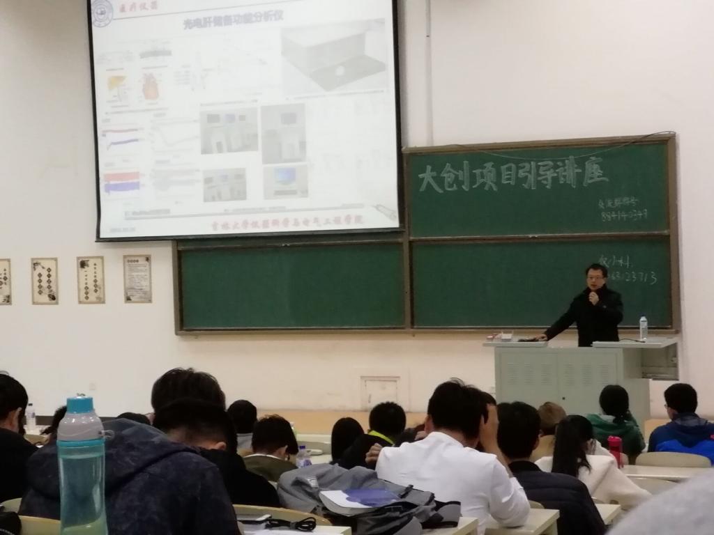为给2017级学生介绍大创项目具体内容,引导学生申请并选择自己感兴趣的大创项目,培养学生理论联系实际的思维,吉林大学大学生科技创新协会于2018年10月26日在李四光楼第二阶梯教室举行了大创项目引导讲座。2018年大创项目引导讲座由千承辉老师主持,王智宏老师、王世隆老师、蔡靖老师,随阳轶老师、林婷婷老师等人主讲,2017级全体学生参与了本次引导讲座。