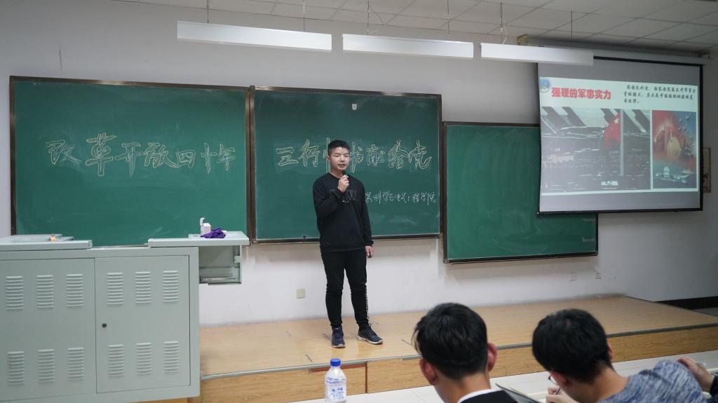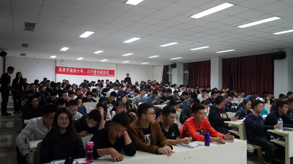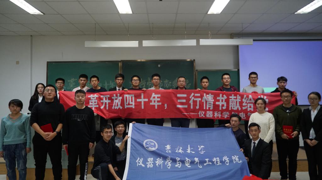紧接着,2018级各班围绕“改革开放四十年”依次上台宣讲,他们展示了自从“改革开放”政策实施以来祖国翻天覆地的变化以及对这一政策的个人理解,最后以“三行情书”的形式表达了对党、对国家的热爱之情。各班宣讲结束后,2016级学生代表崔猛同学为本次活动进行了精彩的演讲。最后,根据评委嘉宾现场评分的统计结果,2018级4班荣获本次活动一等奖,6班和7班荣获二等奖,1班、2班、3班和5班荣获三等奖,最后颁奖嘉宾为获奖班级颁发了荣誉证书并合影留念。