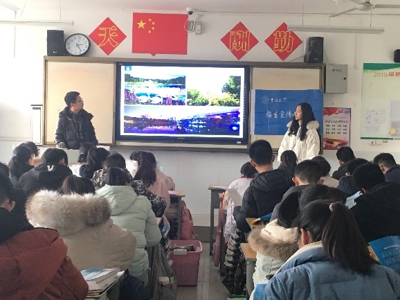 的王博蓉同学以及其他成员依次上台介绍本专业的详细信息,对于高三学子而言,这是一次与大学专业的近距离接触。随后,宣讲团成员又介绍了吉林大学的出国留学率、保研率以及就业前景等方面的具体情况。最后宣讲结束,团成员一起上台为同学们加油,并齐声道:“我们在吉林大学等你来!”。