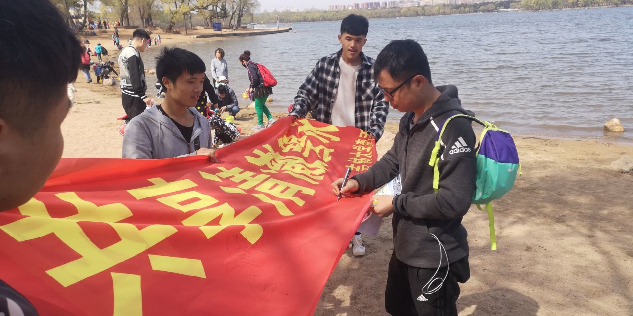 活动开始后,志愿者们不仅将各个角落里的石块、塑料袋、泡沫板,水瓶等垃圾清理干净,还在捡拾公园里的垃圾的同时,向公园中的游客宣传“世界地球日”,并普及地球科学知识。然后组织游客们在条幅签字,向游客们讲解环保小常识,倡导大家保护美丽南湖,从小事做起,践行低碳生活方式。最后向游客赠送纪念书签,并拍照留影。每一位志愿者都热情高涨,他们不怕脏,不怕累,认真地捡拾角落的垃圾,形成一道独特的风景。
