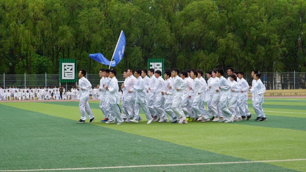 经过为期两周的培训,同学们已经能够完整熟练地完成整套太极拳,准备迎接比赛的到来。上午8:00,队员们在体育场内集合,回忆比赛流程和动作要领,做好赛前准备。仪电学院太极方队由32名队员和一名旗手组成,随着入场口令的下达,方队踏着整齐的步伐,喊着响亮的口号进入场地中央。在舒缓的音乐中,同学们动作舒展大气,节奏稳健,队伍整齐划一,充分展现了太极的柔和之美。