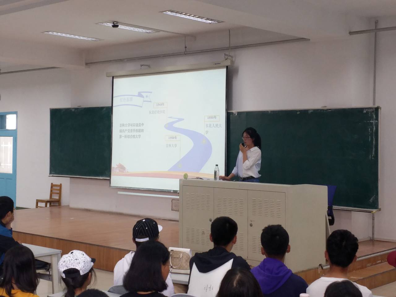第四次新生思政课在吉林大学中心校区第三教学楼第九阶梯教室举行,学院2019级辅导员马姗姗担任主讲,全体2019级新生参加。