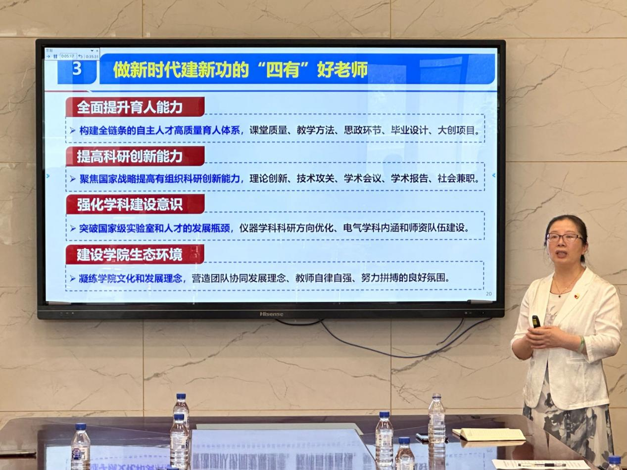 院长嵇艳鞠教授以“争做新时代育人‘四有’好老师,为打造一流教育科技人才建新功”为题为全院教师党员讲授专题党课,学院全体领导班子成员参加了党课学习,学校主题教育第5指导组组长王爱民同志到会指导。