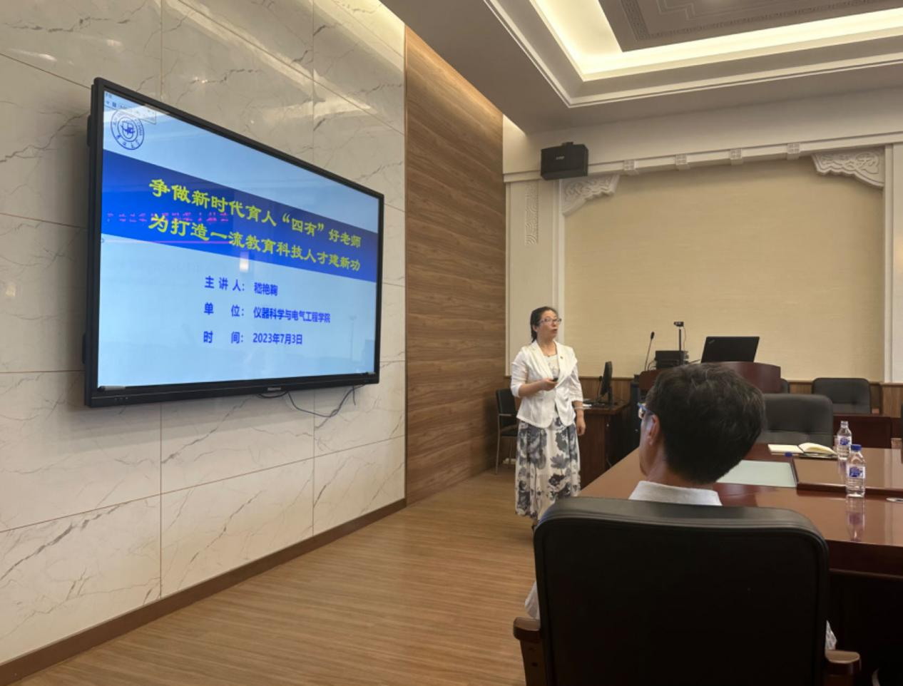 嵇艳鞠同志围绕习近平总书记关于教育、科技、人才的重要论述和习近平总书记在中共中央政治局第五次集体学习时的重要讲话精神,从“建设教育科技人才强国助力伟大复兴”、“做新时代育人的‘四有’好老师”、“做新时代建新功的‘四有’好老师”、“发展和文化理念”四个方面阐述了什么是“四有”好老师、为什么要做“四有”好老师、怎么做“四有”好老师。嵇艳鞠同志结合学院发展实际,指出学院教师要做到“四个相统一”——即坚持教书和育人相统一、坚持言传和身教相统一、坚持潜心问道和关注社会相统一、坚持学术自由和学术规范相统一;做学生的“四个引路人”——即做学生锤炼品格的引路人、做学生学习知识的引路人、做学生创新思维的引路人、做学生奉献祖国的引路人;做“四有”好老师——即有理想信念、有道德情操、有扎实学识、有仁爱之心。
