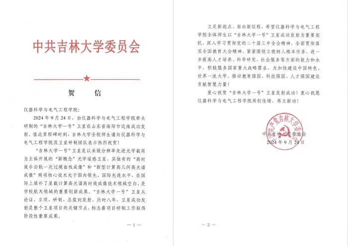 全体师生的关心厚爱,学院党委及全院师生倍感振奋、备受鼓舞,希望全院师生以“吉林大学一号”卫星成功发射为重要契机,深入学习贯彻党的二十届三中全会精神,全面贯彻落实全国教育大会精神,认真学习学校党委《贺信》精神,紧紧围绕立德树人根本任务,进一步提高人才培养、科学研究、社会服务等方面的能力和水平,积极服务国家重大战略需求,为加快建设中国特色、世界一流大学,推动教育强国、科技强国、人才强国建设贡献智慧力量!