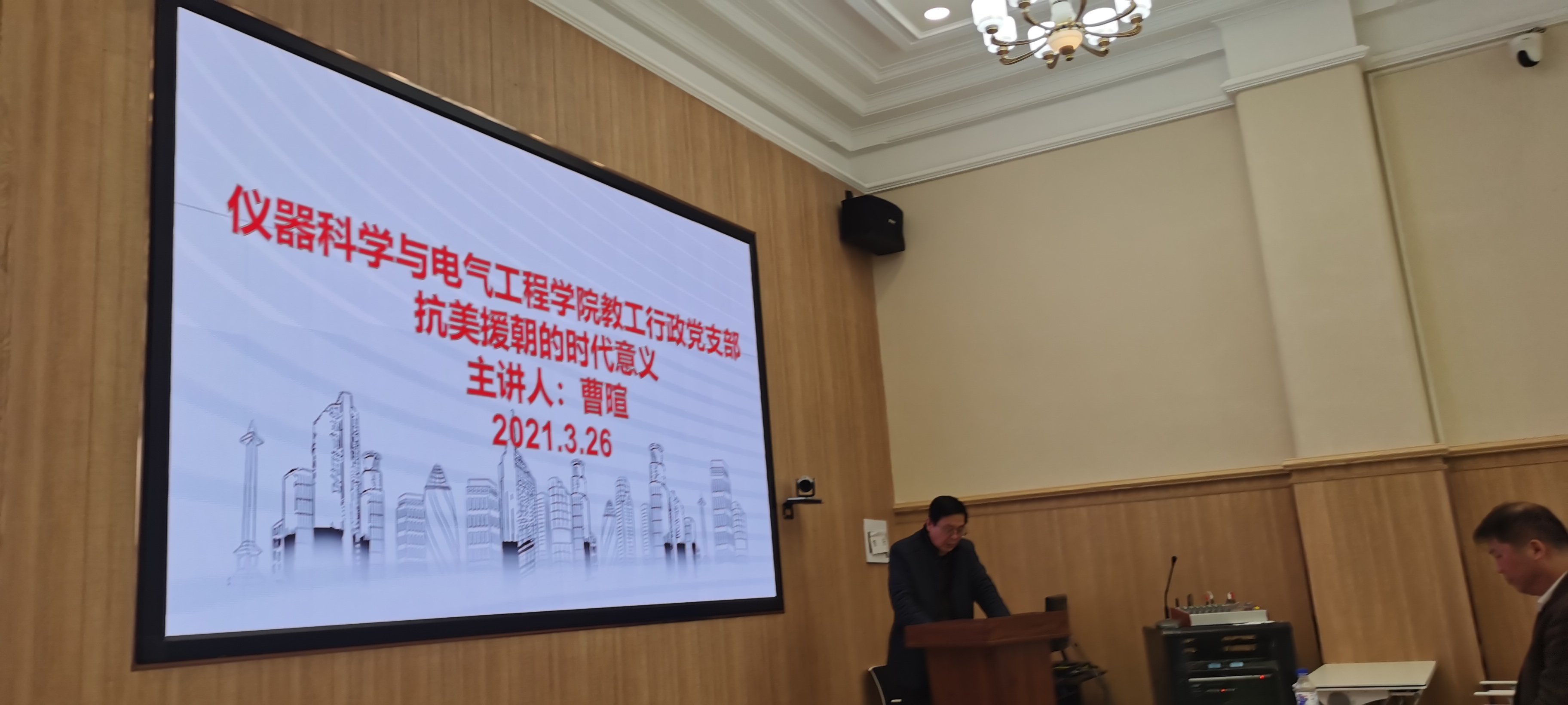 20210326日上午九点,吉林大学仪电学院教工行政党支部在地质宫208开展“抗美援朝的时代意义”主题党日活动,会议由学院教工行政党支部书记边江主持,学院党委书记邱增凯与支部成员参加会议。