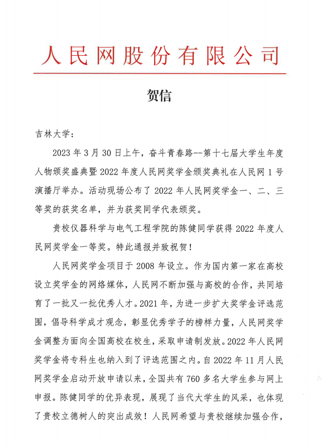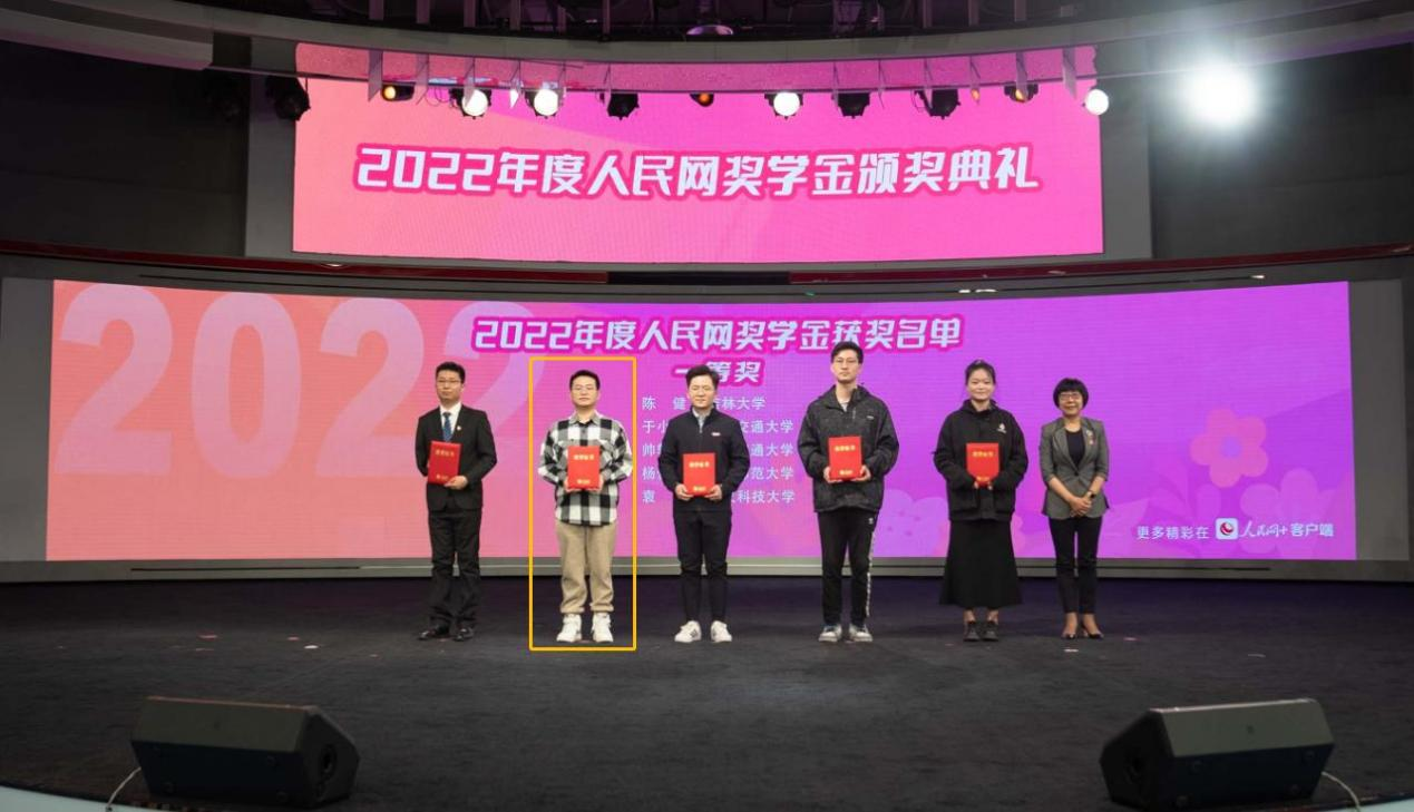 在读博士研究生陈健以全国总分排名第1的优异成绩获得2022年度人民网奖学金一等奖。