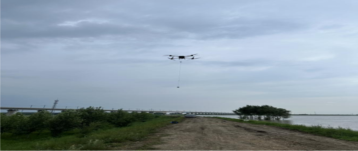 图7 无人机搭载自主研发的堤坝管涌探测仪进行探测